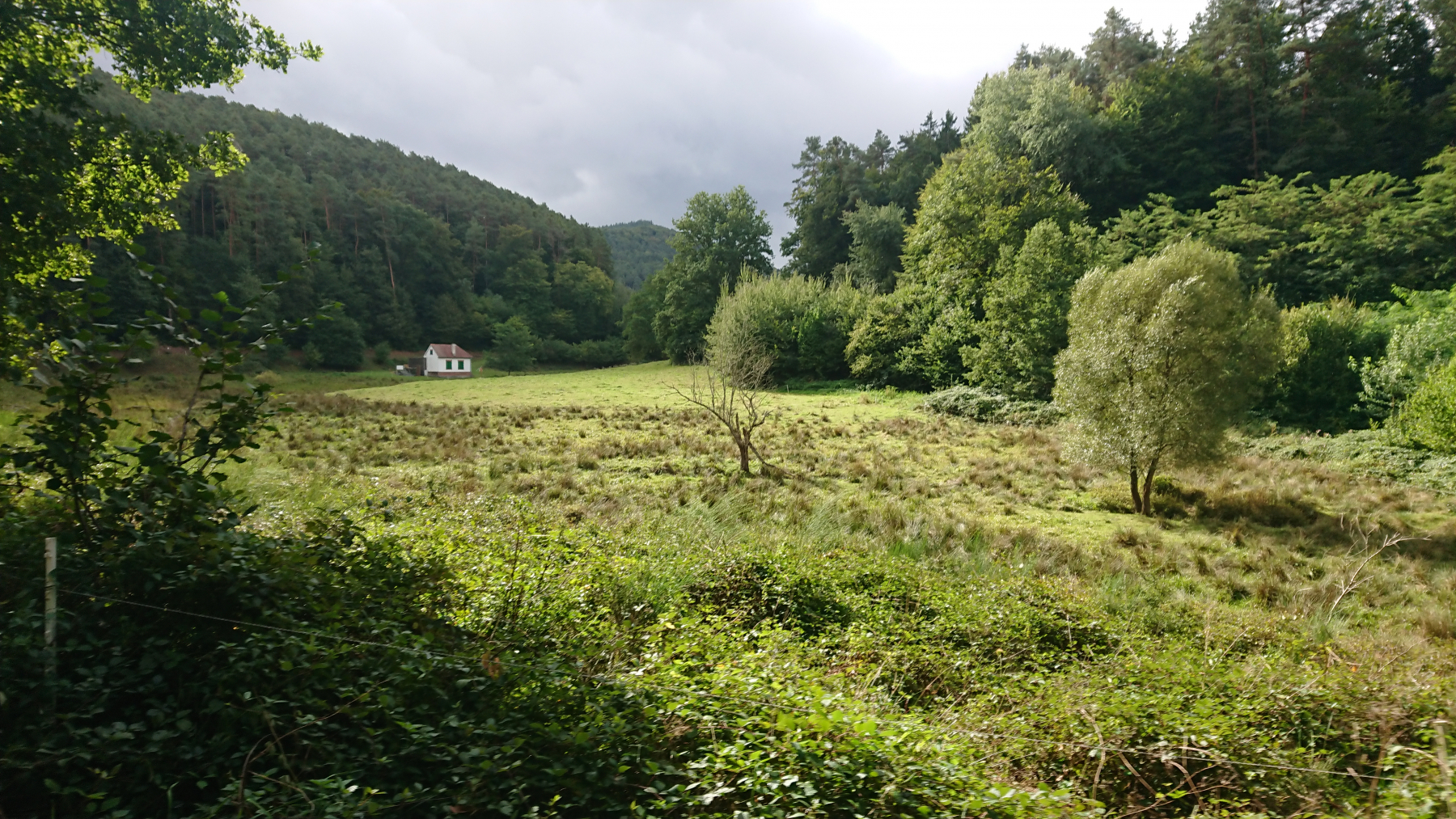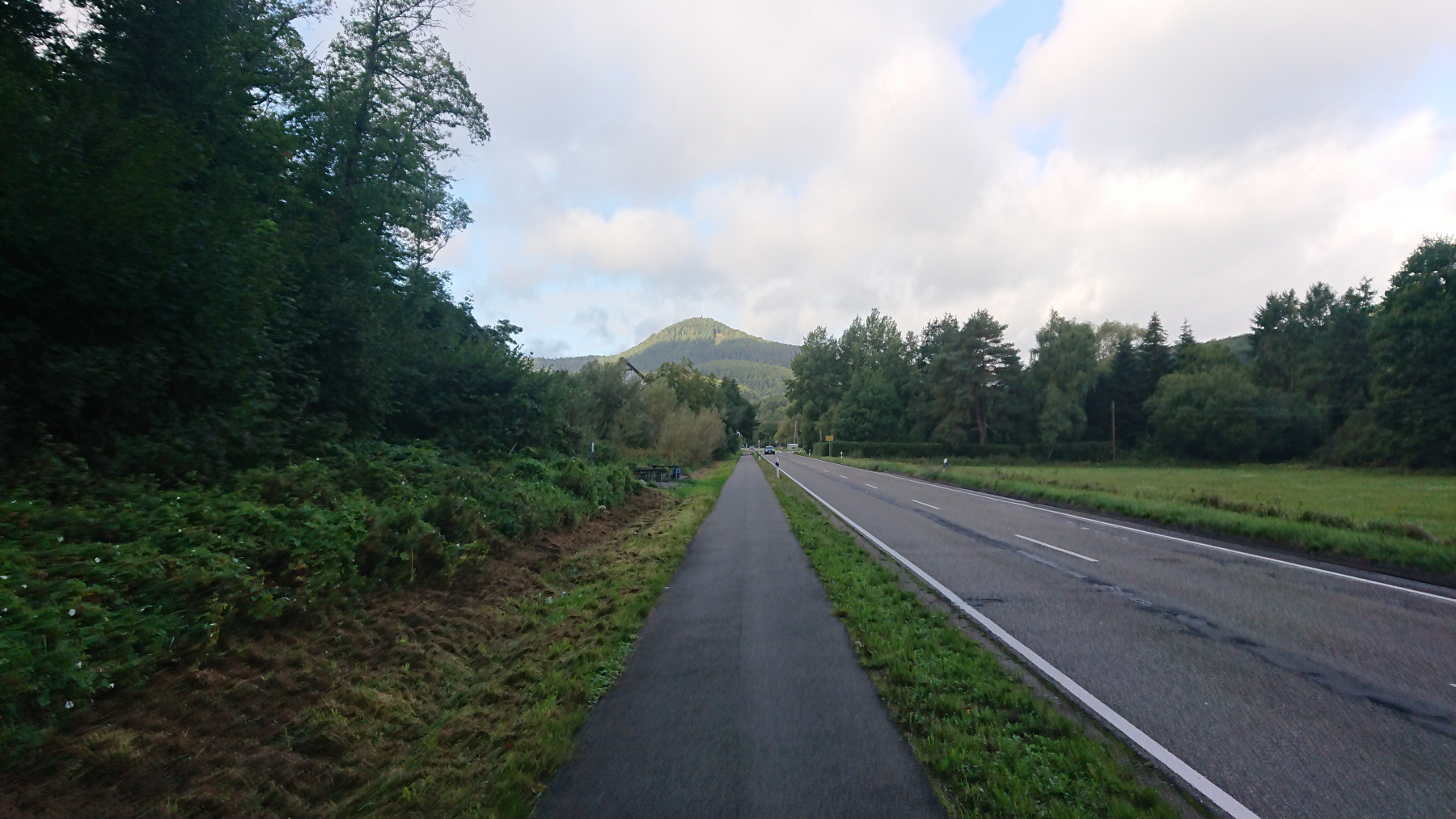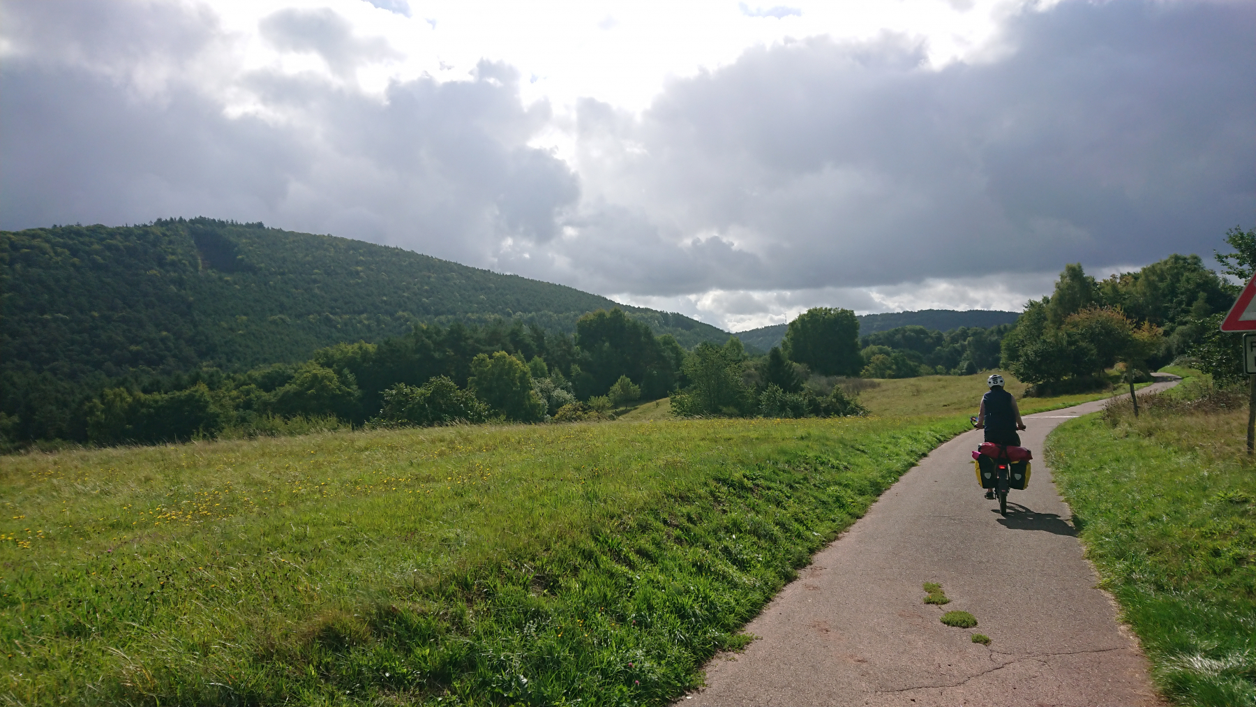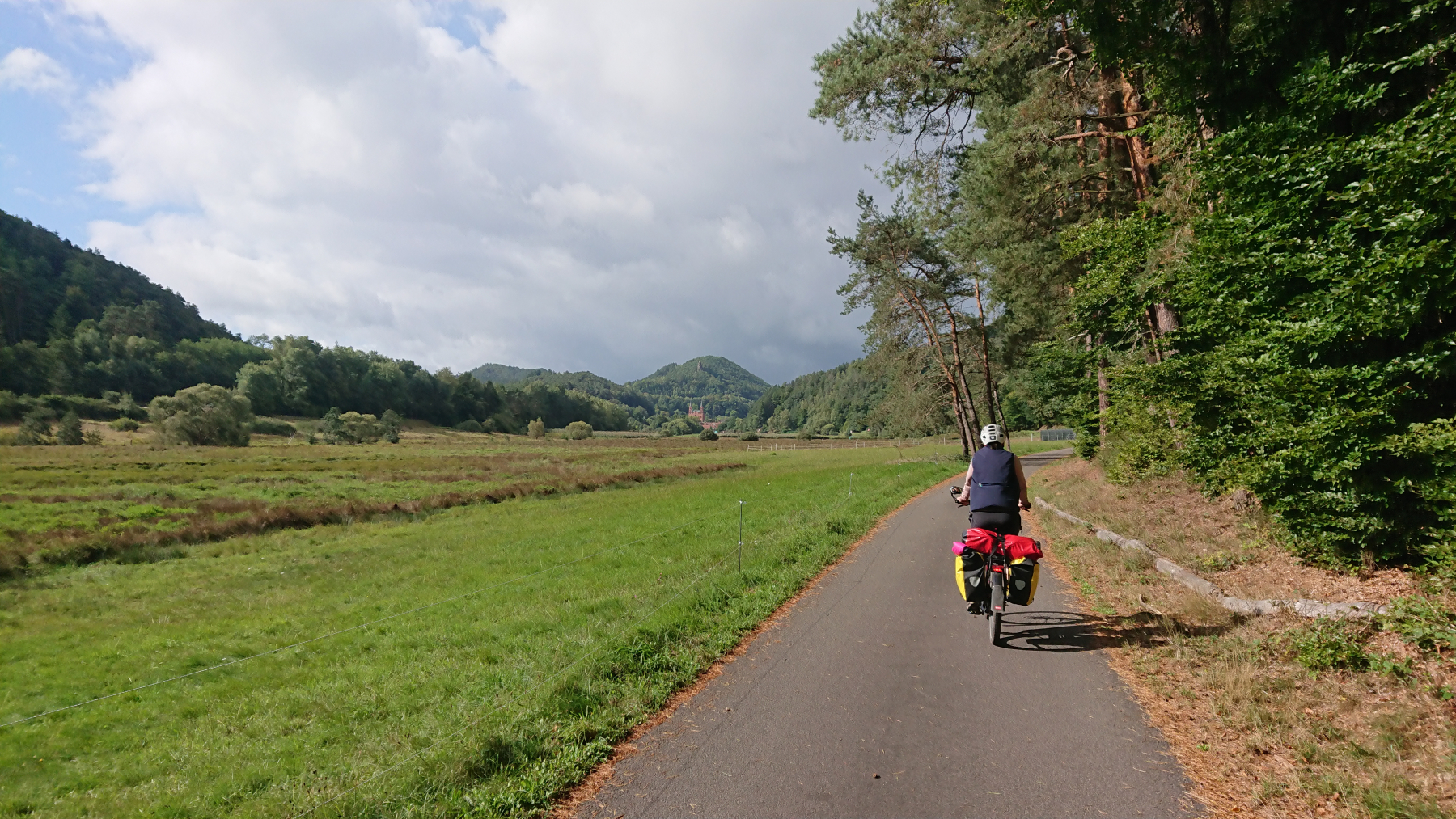 Nach etwas mehr als einer Stunde Fahrt trübt sich das Wetter ein wenig ein. Dicke Wolken ziehen auf, aber noch bleibt es trocken. Obwohl wir größtenteils im Tal Queich, am Hirtenbach oder der Rodalb oder anderer kleinere Flüsse und Bäche entlang fahren, ist es doch ein stetiges auf und ab. Aber die Lanschaft ist schö, die Wege gut bis sehr gut. Hin und wieder mal durch ein Ortschaft und kaum Verkehr. Zwischendurf fallen auch ein paar Tropfen (Der Wetterbericht hatte für heute Regen angesagt) aber das ist nicht so viel, dass wir die Regensachen benötigen würden.