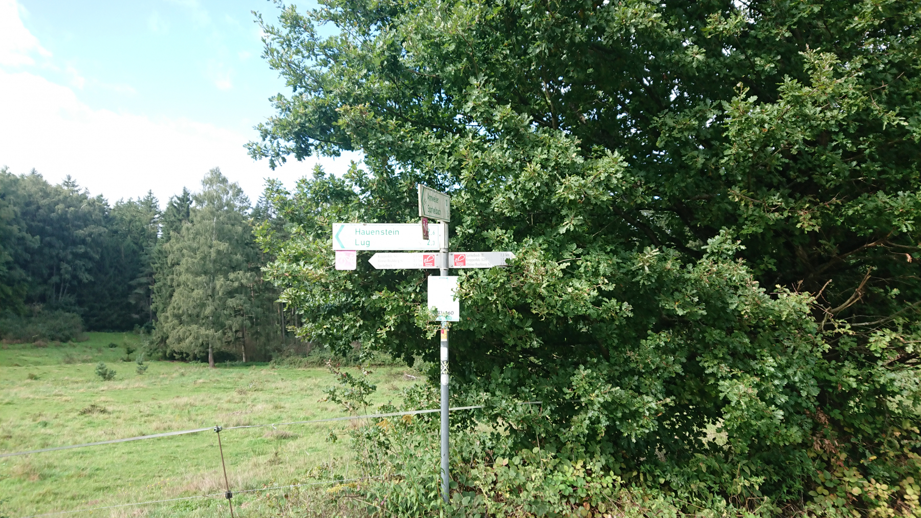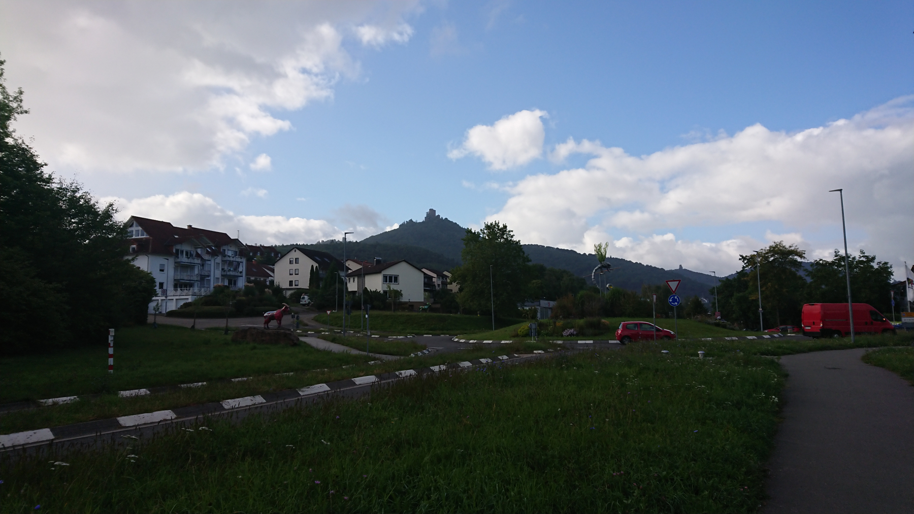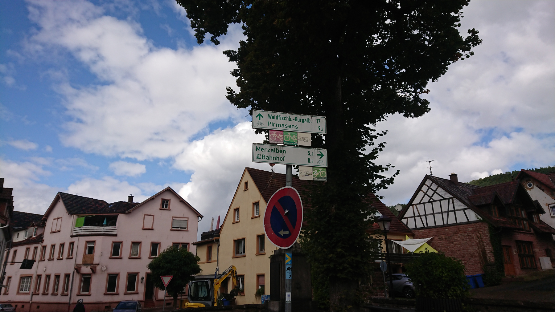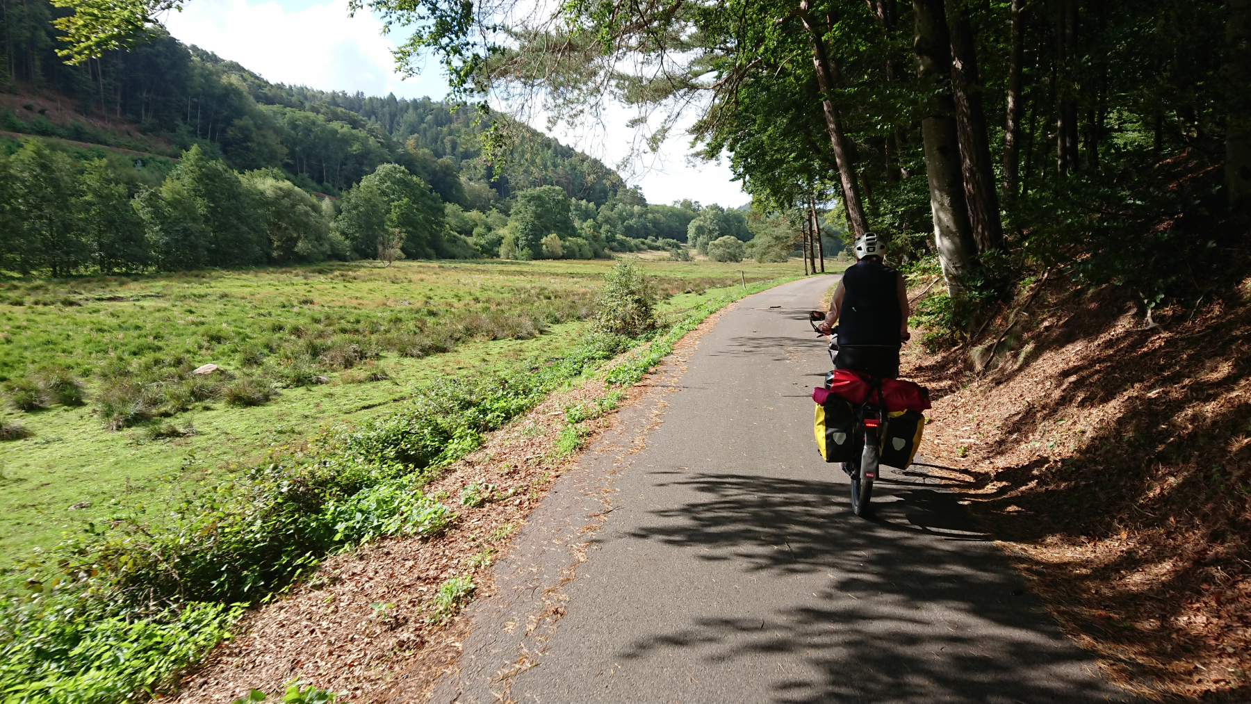Nach etwas mehr als einer Stunde Fahrt trübt sich das Wetter ein wenig ein. Dicke Wolken ziehen auf, aber noch bleibt es trocken. Obwohl wir größtenteils im Tal Queich, am Hirtenbach oder der Rodalb oder anderer kleinere Flüsse und Bäche entlang fahren, ist es doch ein stetiges auf und ab. Aber die Lanschaft ist schö, die Wege gut bis sehr gut. Hin und wieder mal durch ein Ortschaft und kaum Verkehr. Zwischendurf fallen auch ein paar Tropfen (Der Wetterbericht hatte für heute Regen angesagt) aber das ist nicht so viel, dass wir die Regensachen benötigen würden.