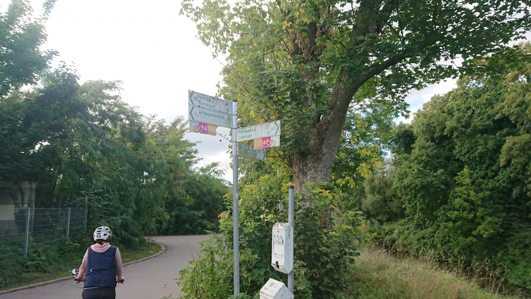 und nähern uns Zweibrücken, wo wir planen eine Mittagspause zu machen. Nachladen werden wir heute nicht, denn die Akkus sind noch hinreichend für die letzten knapp 20km gefüllt. In der Innenstadt beim Bäcker nehmen wir Toast-Hawai und einen Kakao zu uns. Abends werden wir am Ziel auch eine warme Malzeit bekommen, so kann es hier ein kleiner Snack sein.