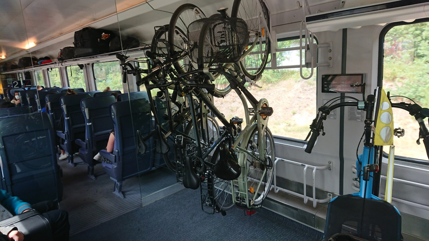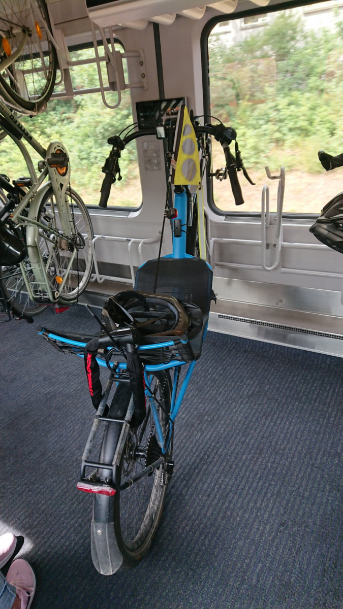 Um 15:00 Uhr geht dann unser IC nach Osnabrück. Für das Liegerad wurde uns geraten, einen Tandemplatz zu reservieren. Allerdings gibt es in diesem IC keinen ausgewiesenen Tandemplatz und in die Hochkant-Stell-Plätze kann ich die breiten Reifen nicht einhängen. Christoph hat da keine Probleme uns do stelle ich meinen Wolf in seinen und er sein Rad in den “Tandemstellplatz”. Wie man dort aber ein Tandem unterbringen soll, ist mir ein Rätsel.