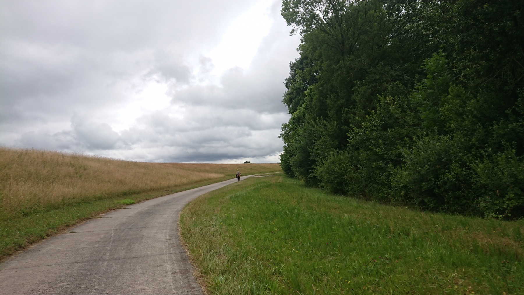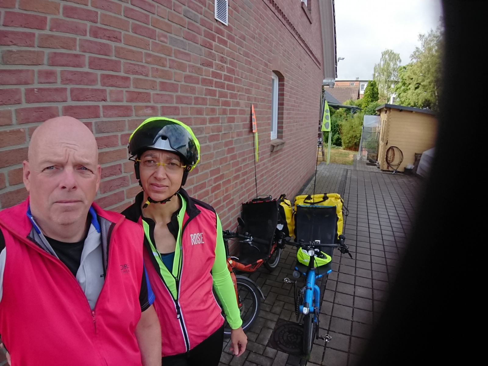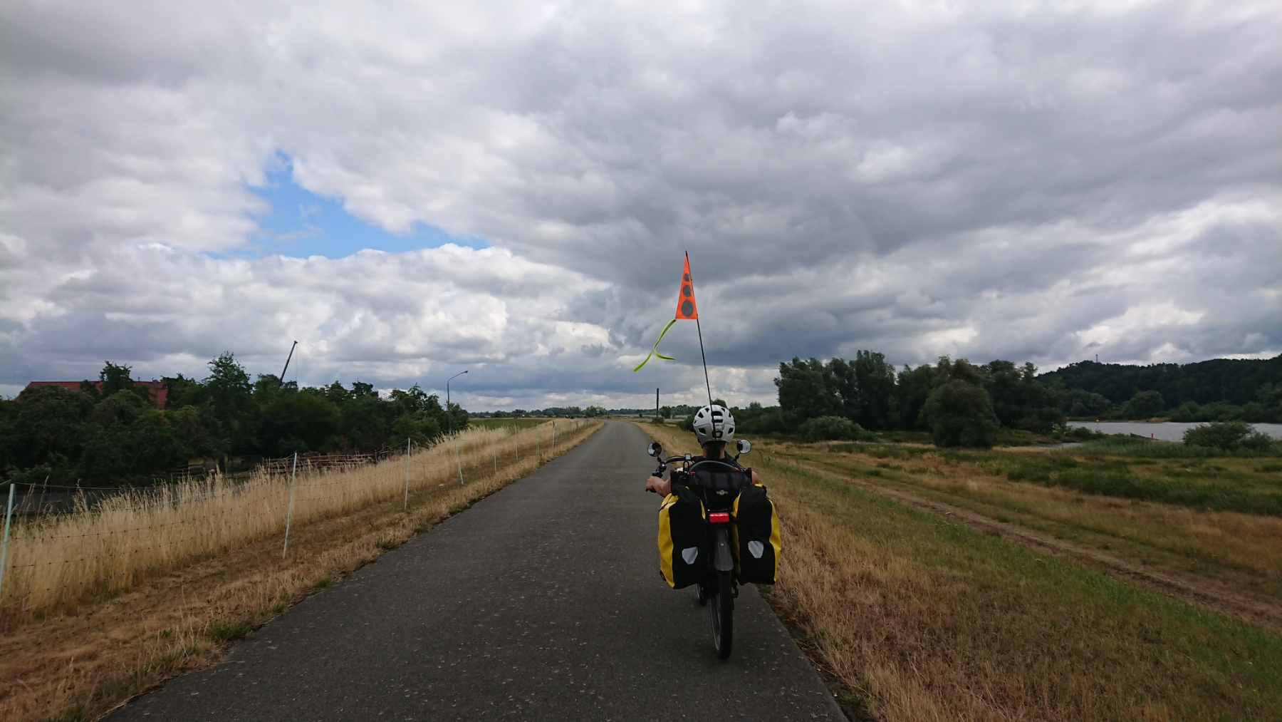 Heute ist es so weit: Nachdem wir gestern die wenigen Sachen, die wir für eine Mehrtagestour benötigen, schon eingepackt hatten, Ersatzschläuche und Werkzeug hinzugetan hatten, konnte es nun losgehen. Obwohl die Wettervorhersage einige Schauer angekündigt hat und der Himmel recht grau ist, brechen wir um 10:00 Uhr auf. In der Ferne ziehen dunkle Wolken auf, aber noch ist es trocken.
