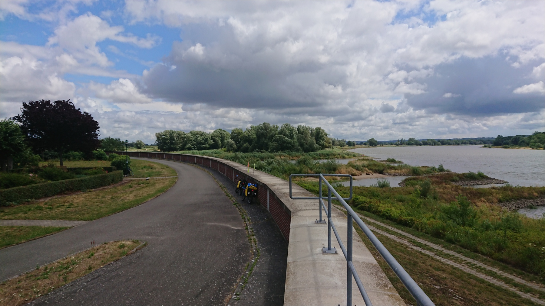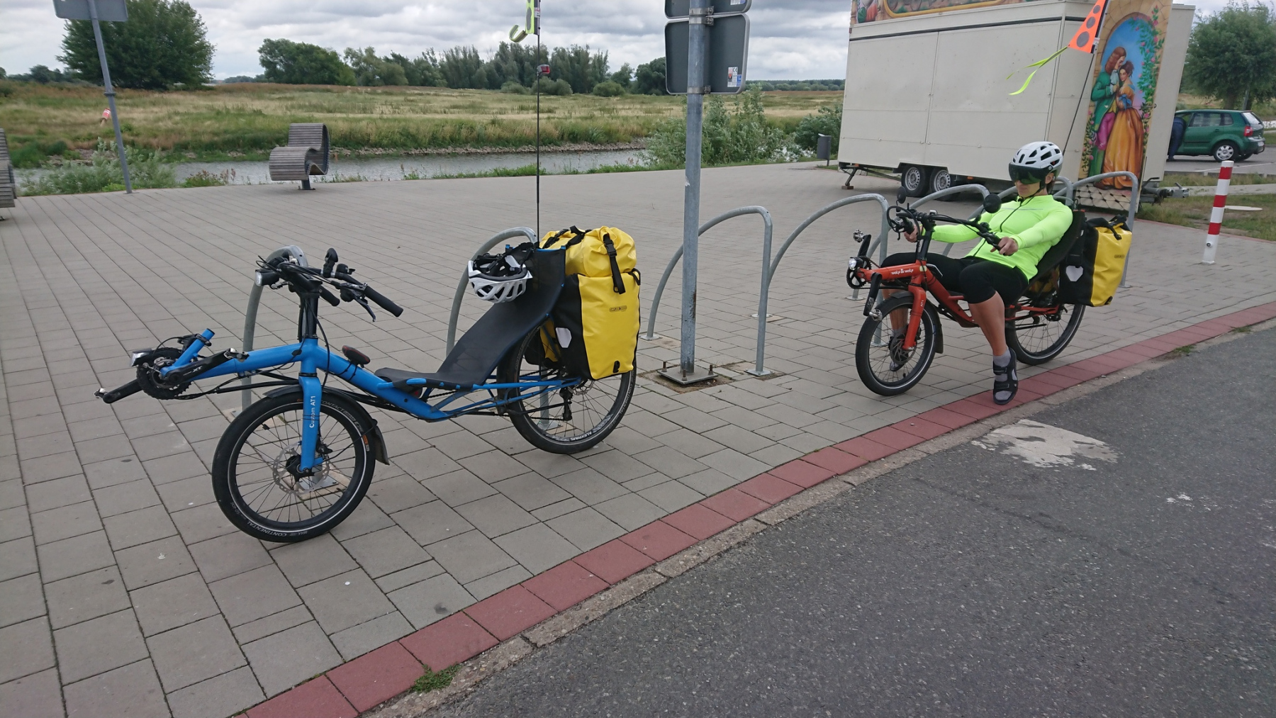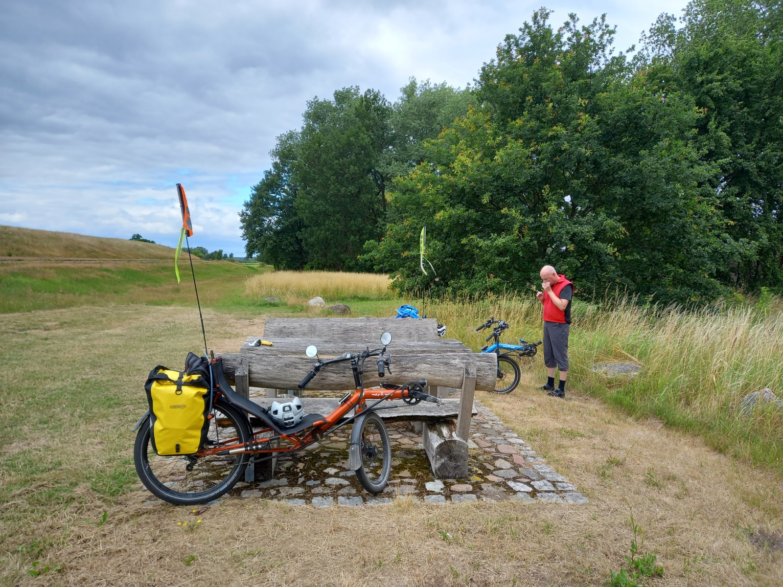 Heute ist es so weit: Nachdem wir gestern die wenigen Sachen, die wir für eine Mehrtagestour benötigen, schon eingepackt hatten, Ersatzschläuche und Werkzeug hinzugetan hatten, konnte es nun losgehen. Obwohl die Wettervorhersage einige Schauer angekündigt hat und der Himmel recht grau ist, brechen wir um 10:00 Uhr auf. In der Ferne ziehen dunkle Wolken auf, aber noch ist es trocken.
