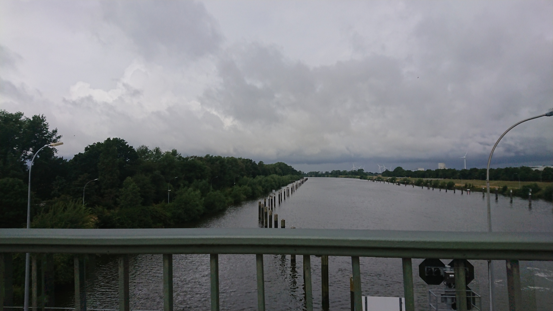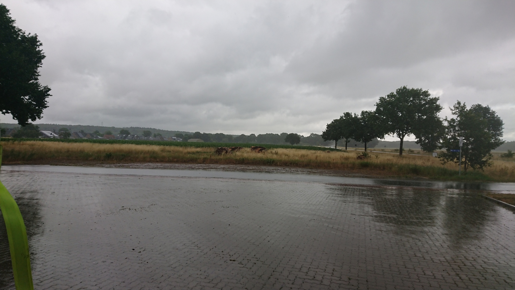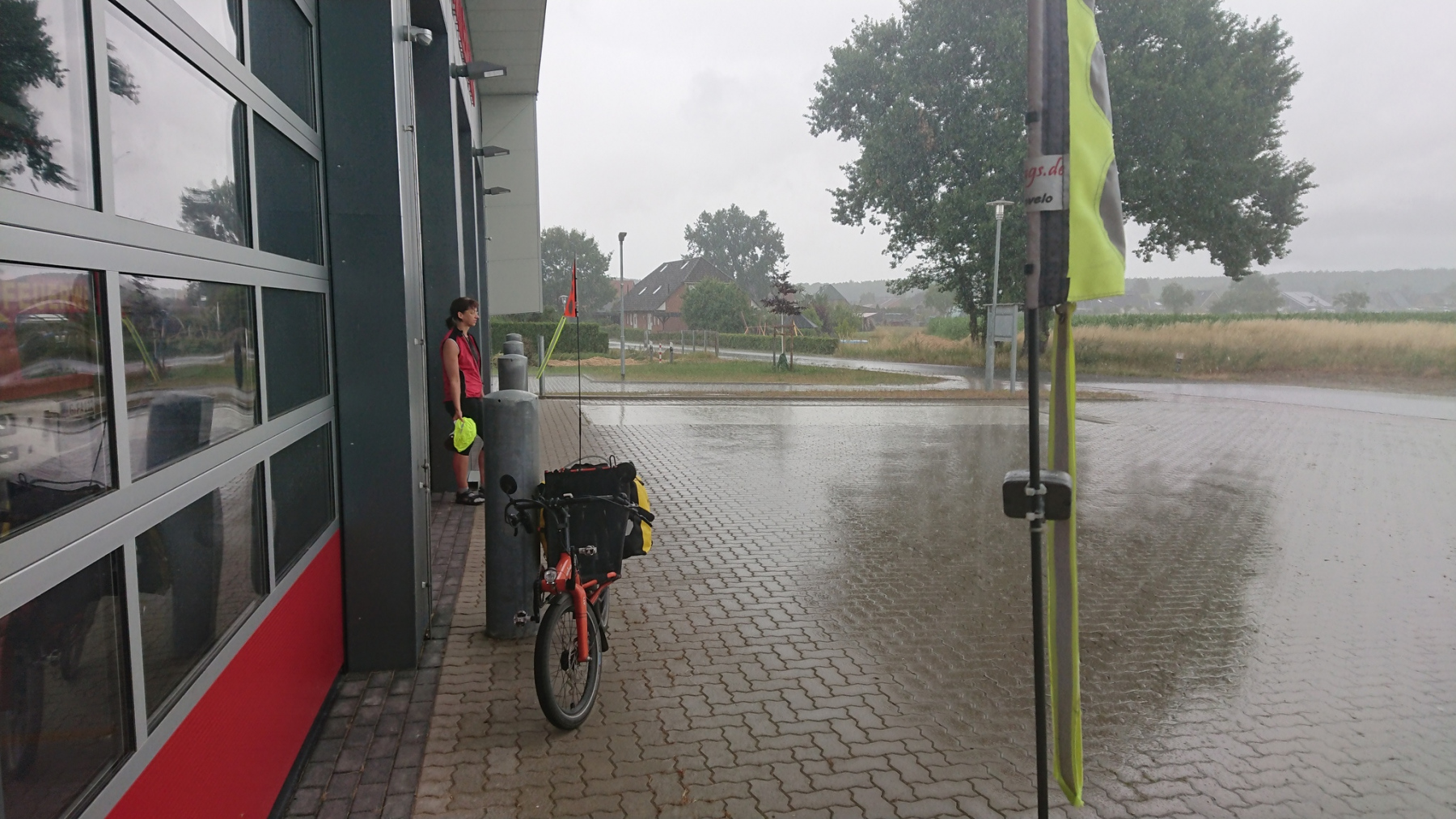 Aber wir müssen nur kurz warten und die dunklen Wolken, die näher gekommen sind, können uns noch nicht erreichen. Doch schon in Artlenburg müssen wir uns entscheiden: Unterstellen oder weiterfahren, denn es beginnt zu tröpfeln. Aus dem Tröpfeln wir dann schnell ein ordentlicher Schauer. Gut, dass wir uns bei der Feuerwehr untergestellt haben. Unter dem Vordach der Wagenhalle sind wir einiergmaßen geschützt. Eine Mitarbeiterin der Kommune kommt vorbei, um eine Hygienespülung durchzuführen und öffnet die Wagenhalle. Dort ist es viel angenehmer und wir können den Schauer abwarten.
