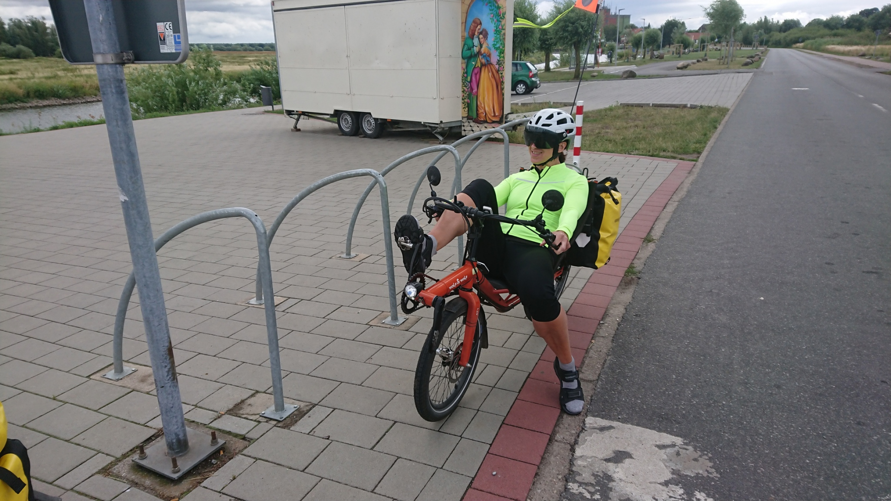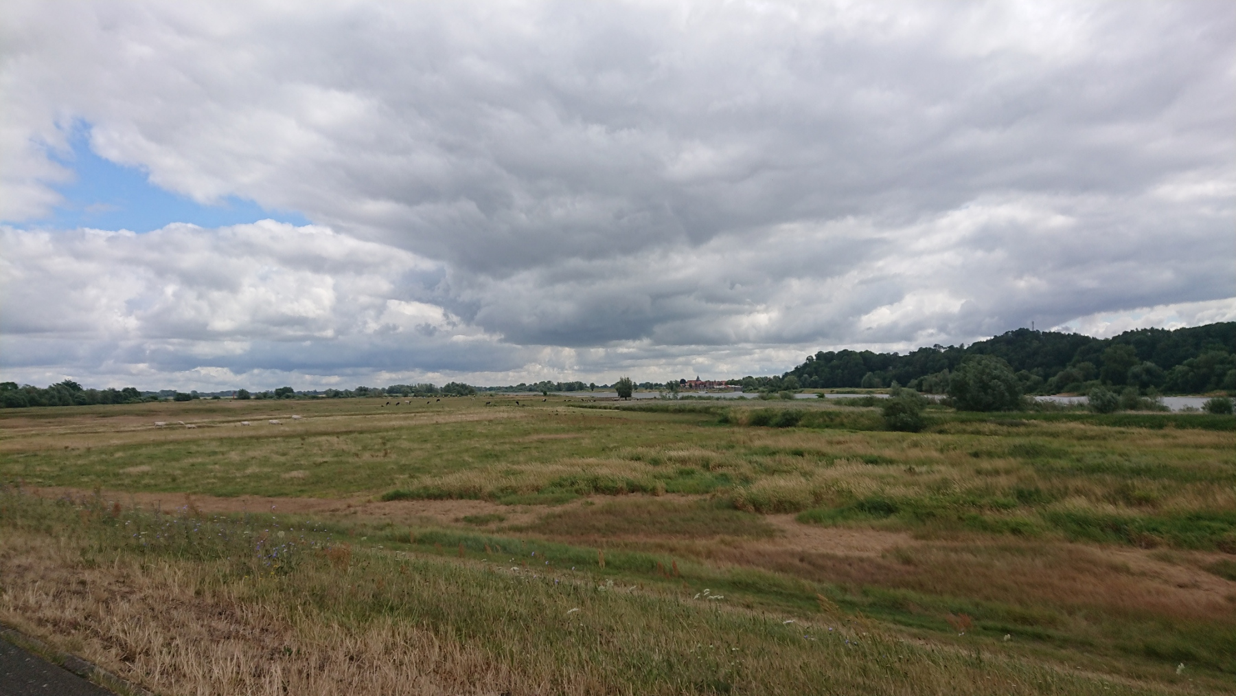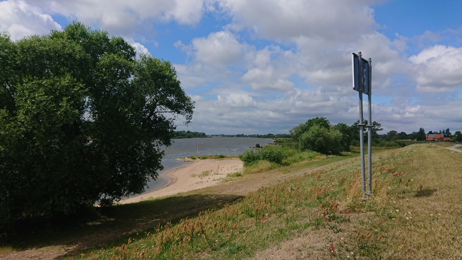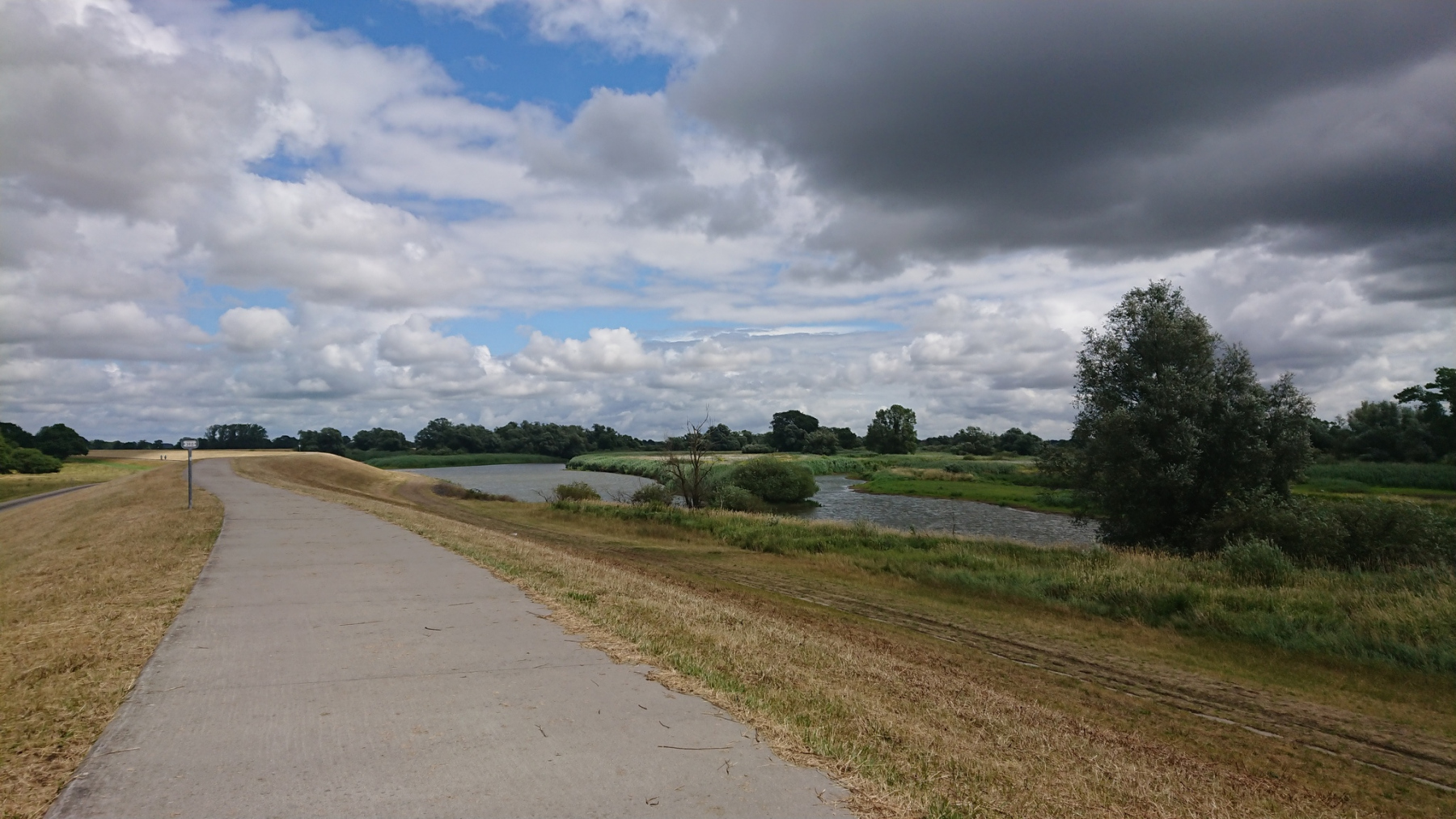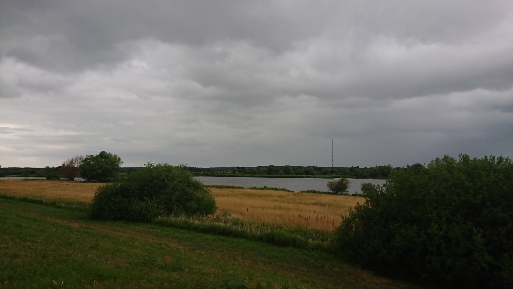 Kaum ist der Schauer abgeklungen, machen wir uns weiter auf den Weg. Die Strecke ist uns gut vertraut, sind wir doch schon viele Male nach Bleckede gefahren. Nun erstmal was essen, aber der lokale Italiener hat geschlossen und eine Wurst am Imbiss, danach steht uns nicht der Sinn. Im Bistro am Hafen bekommen wir Pasta mit Pesto: einfach, aber es macht satt und füllt die verbrauchten Kalorien wieder auf. In Bleckede mit der Fähre ans Nordufer der Elbe und weiter entlang der Elbe immer gen Osten. Das Wetter wird besser, es zeigen sich erste Wolkenlücken und die Sonne blitzt immer mal wieder kurz durch die Lücken.