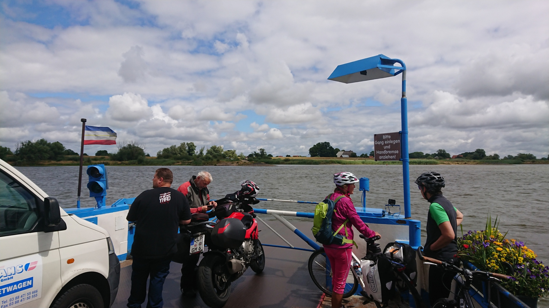 Nach etwa 80 km sehen wir Hitzacker auf der anderen Seite der Elbe. Aber bis zu unserem Ziel sind es noch rund 40 km. Wir könnten nun mit der kleinen Fähre übersetzen und so einige km einsparen, aber wir entscheiden uns, auf der nördlichen Elbseite weiter zu fahren.