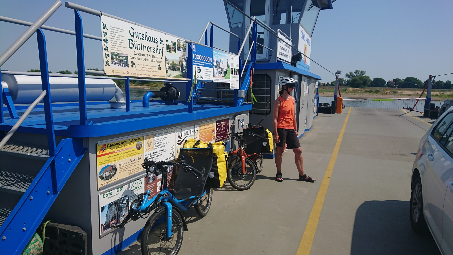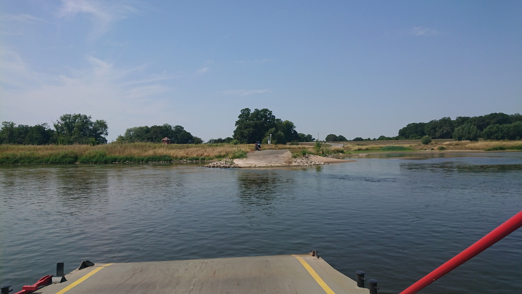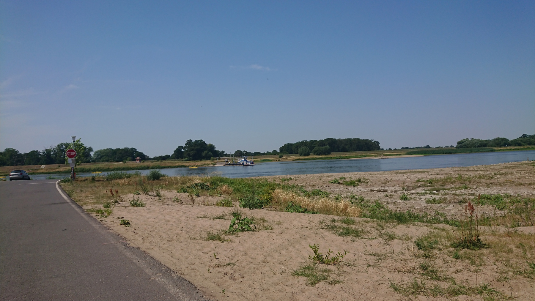 Bevor wir zum Hotel fahren, nutzen wir den am Wegesrand liegenden Rewe Markt für eine Abkühlung. Draußen ist es mit 35 oder 36°C dermaßen heiss, dass wir uns eigentlich nicht mehr groß bewegen wollen. Innen im klimatisierten Markt erstehen wir gekühlte Getränke und beim Bäcker im Kassenbereich etwas Kuchen. Eine gute Stunde verbringen wir so und kühlen langsam auf Normaltemperatur ab. Da das Hotel immer noch nicht geöffnet hat, machen wir noch einen Abstecher in den Schlosspark von Plaue. Sitzen dort im Schatten auf einer Bank am Schloss und schauen dem Schiffsverkehr auf der Havel zu.