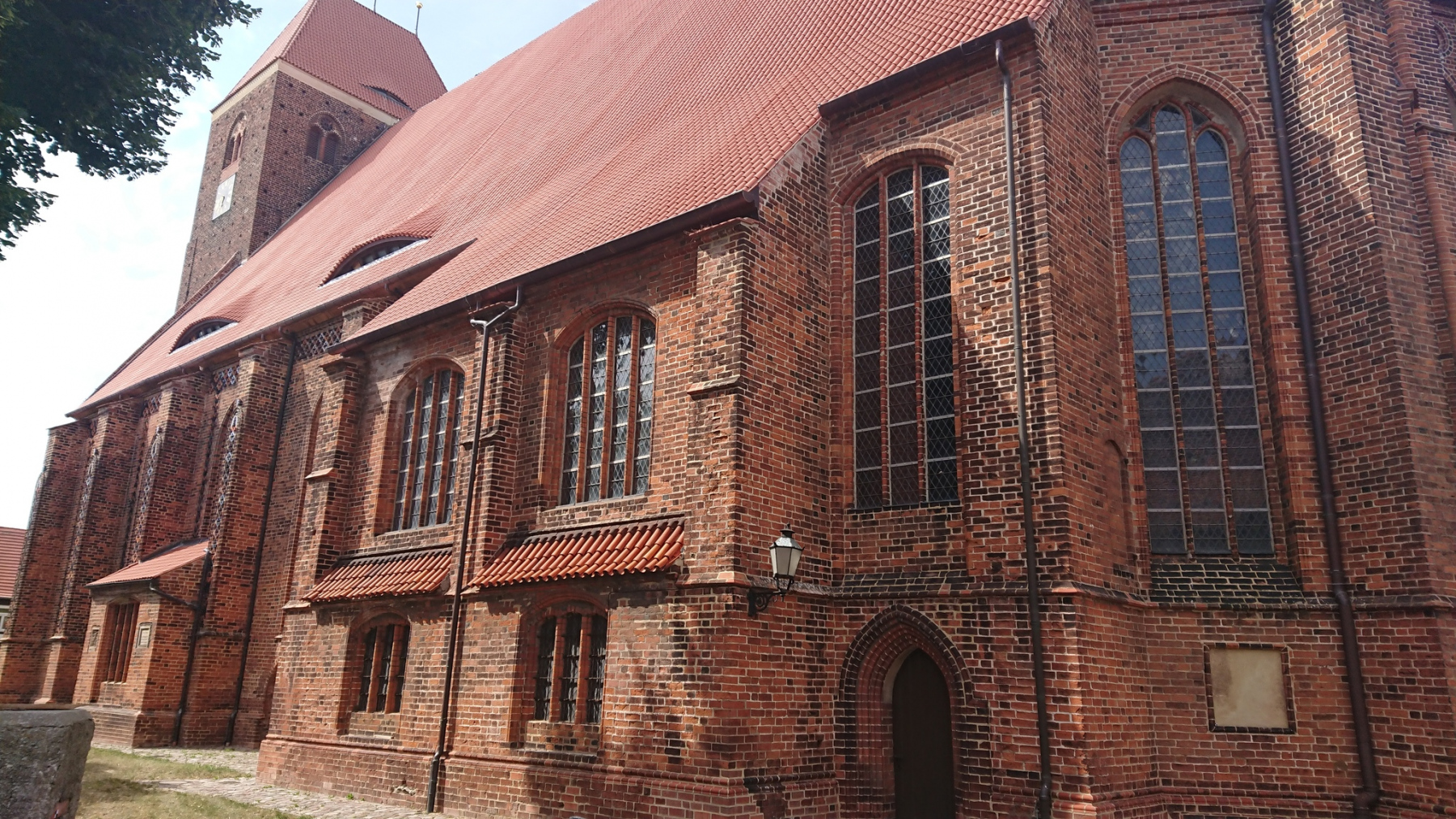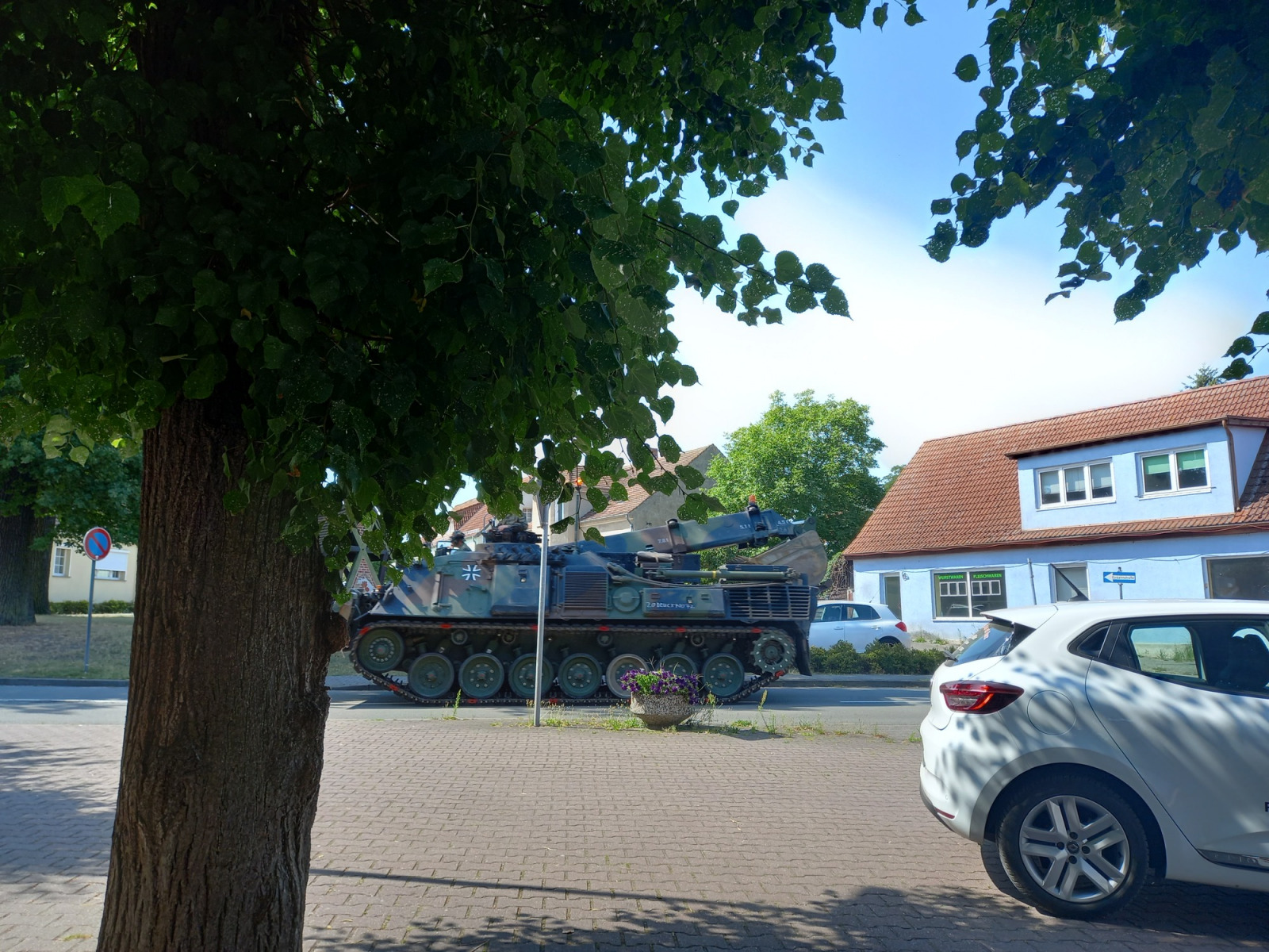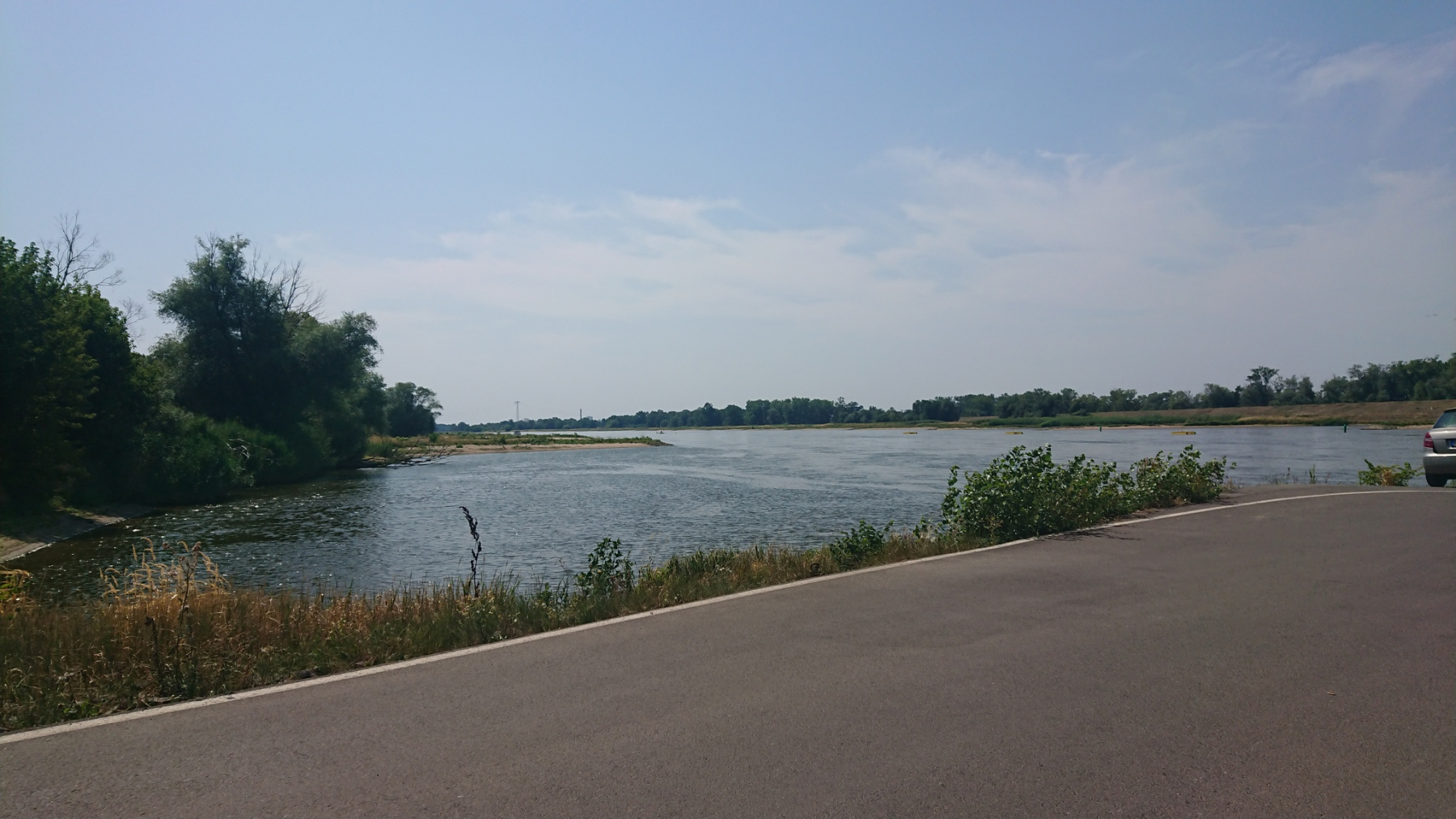 Bevor wir zum Hotel fahren, nutzen wir den am Wegesrand liegenden Rewe Markt für eine Abkühlung. Draußen ist es mit 35 oder 36°C dermaßen heiss, dass wir uns eigentlich nicht mehr groß bewegen wollen. Innen im klimatisierten Markt erstehen wir gekühlte Getränke und beim Bäcker im Kassenbereich etwas Kuchen. Eine gute Stunde verbringen wir so und kühlen langsam auf Normaltemperatur ab. Da das Hotel immer noch nicht geöffnet hat, machen wir noch einen Abstecher in den Schlosspark von Plaue. Sitzen dort im Schatten auf einer Bank am Schloss und schauen dem Schiffsverkehr auf der Havel zu.