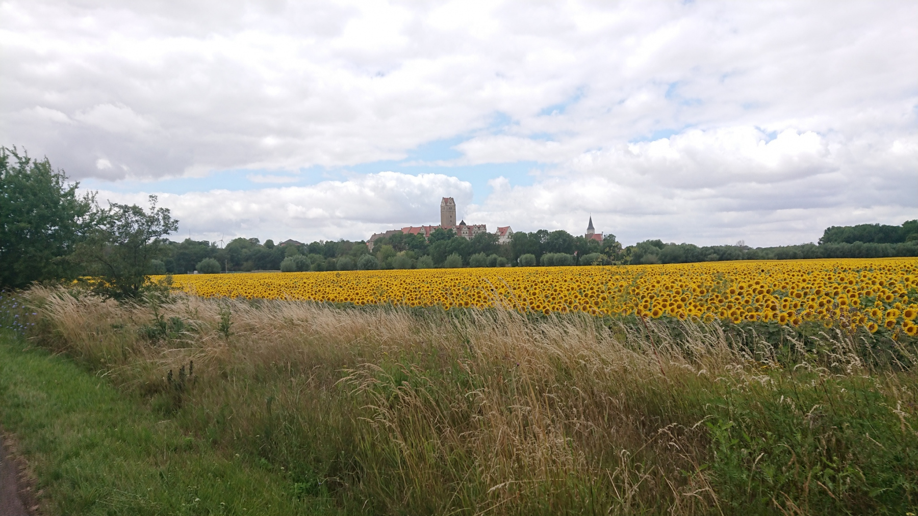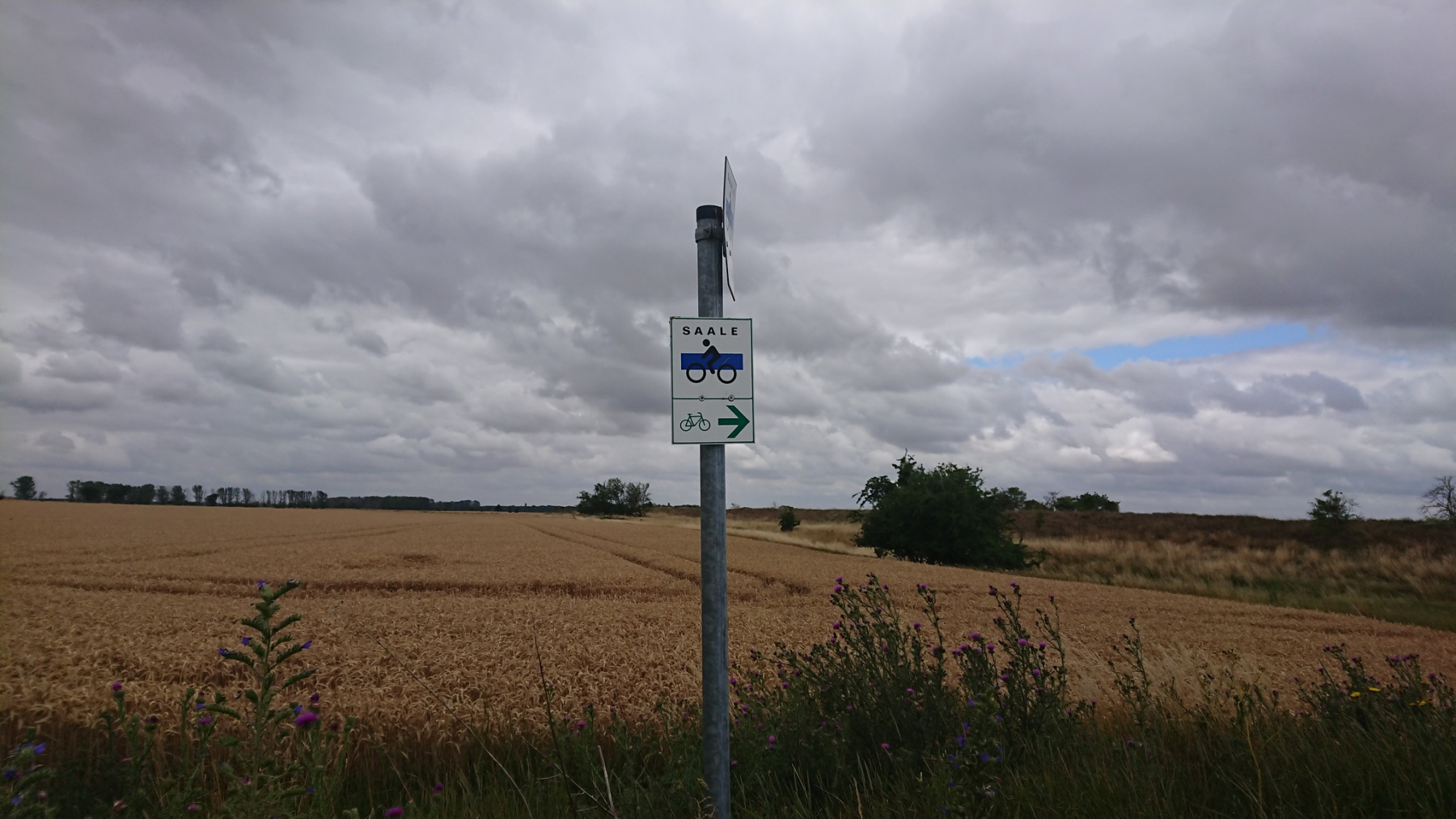Wir haben die Fähre Breitenhagen gewählt, damit wir nicht auch noch die kleine Fähre an der Saale in Groß Roseburg nutzen müssen. Der Radweg hier entlang der Saale ist neu und gut. Nur der Gegenwind macht uns zu schaffen und drückt das Tempo, Abscnittsweise ist der Radweg auch noch nicht erneuert und zeigt uns, wie zu DDR-Zeiten Betonplattenwege überall ausgesehen haben müssen.