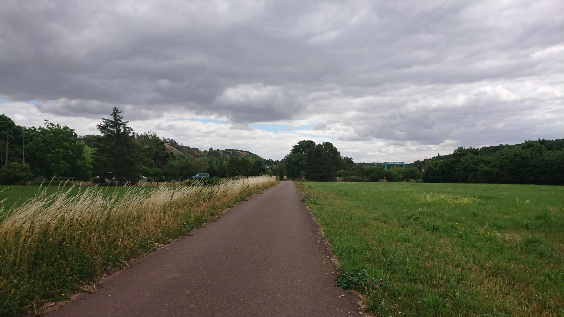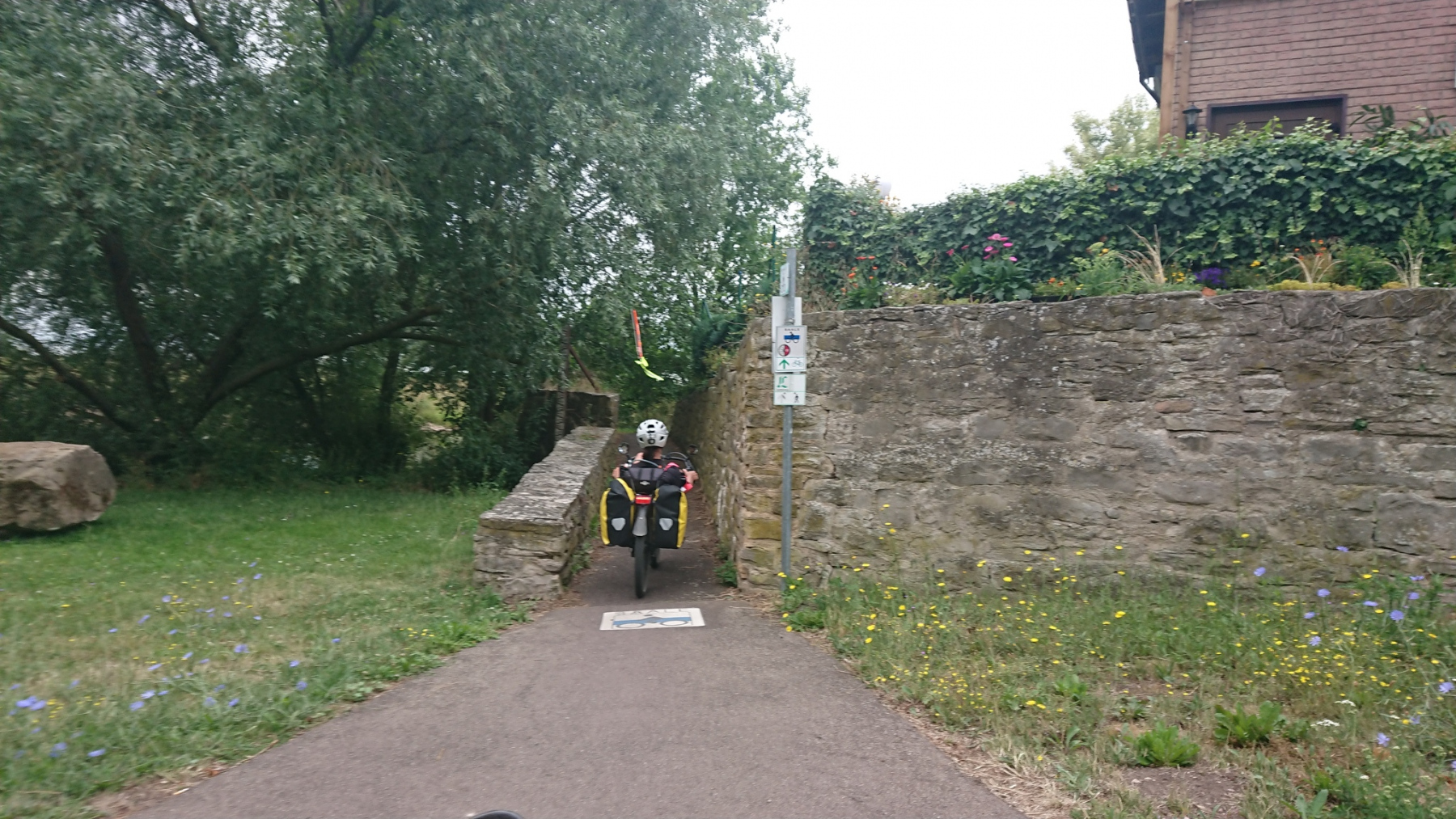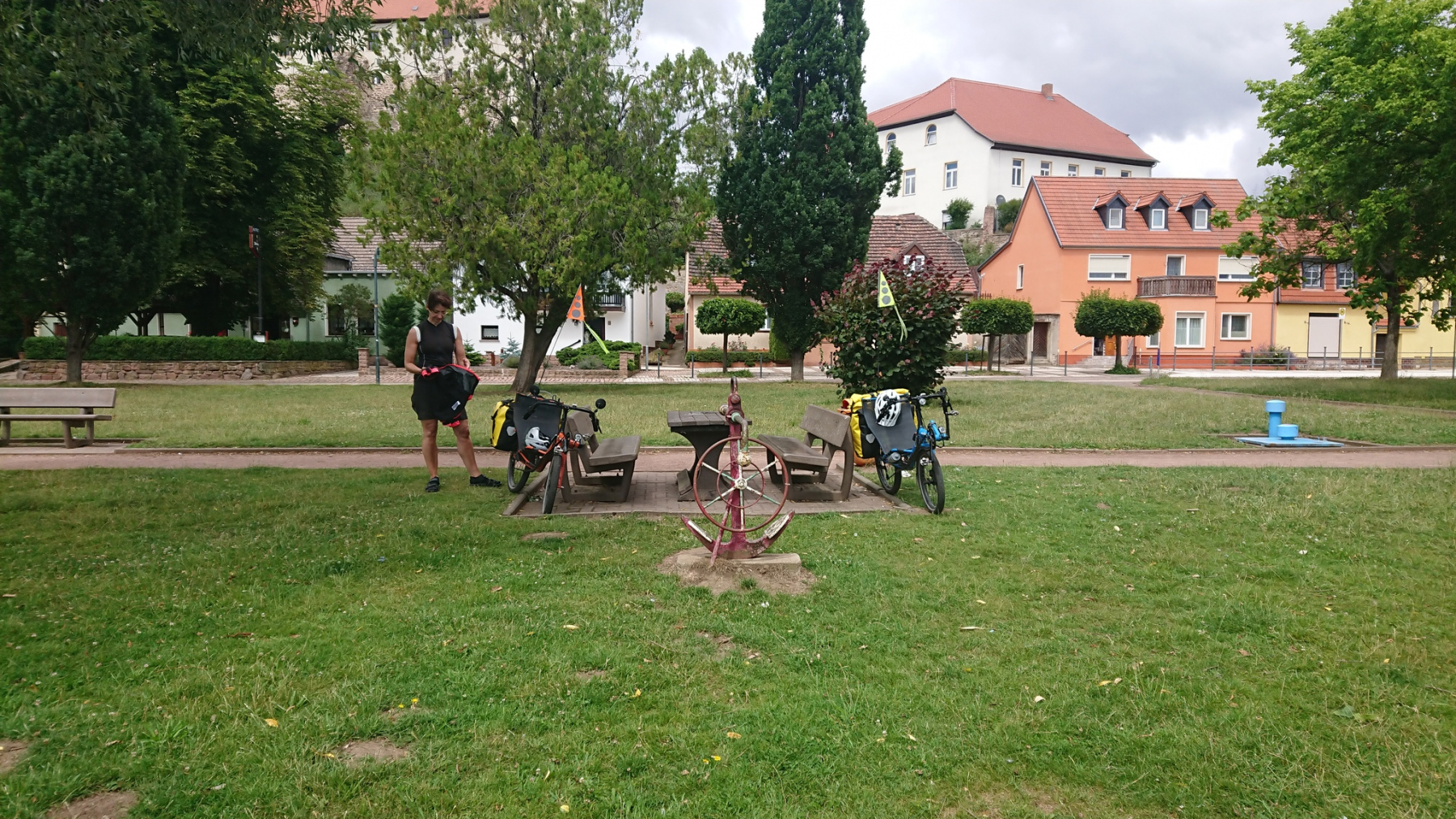 Wieder wechseln wir sie Saaleseite. Und dann werden wir umgeleitet. Der Saaleradweg ist gesperrt und wir folgen der Umleitung. Die ist zwar gut beschildert, aber der Weg führt durch Parks und die Wege sind in einem schlechten Zustand, dass auch hier wieder meist nur zwischen 10 und 15 km/h gefahren werden kann. Hinzu kommen noch etliche Querstraßen, die wir kreuzen müssen. Insgesamt brauchen wir für die Umleitung von etwas mehr als 2km rund 10 Minuten – gefühlt aber deutlich länger.