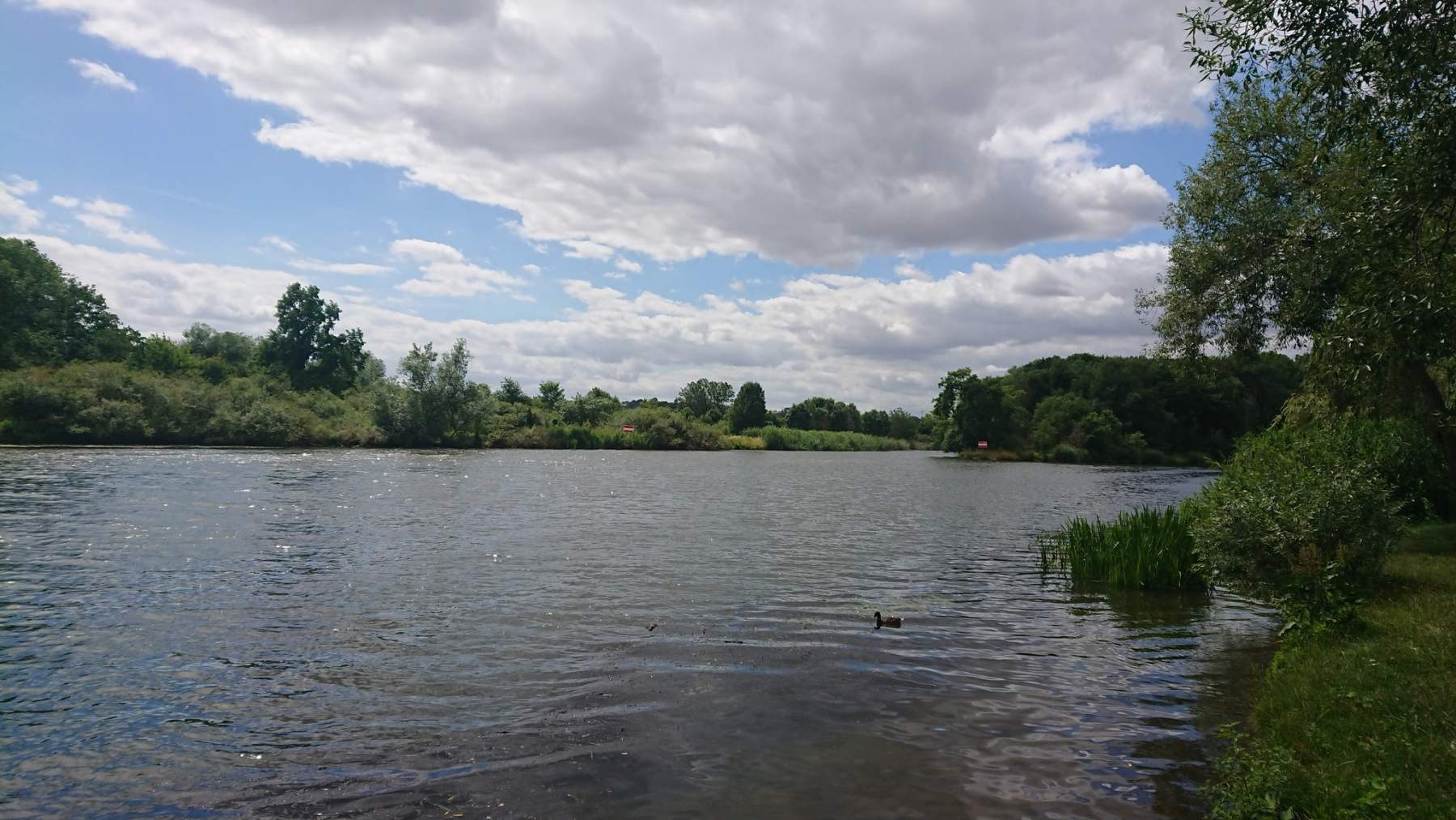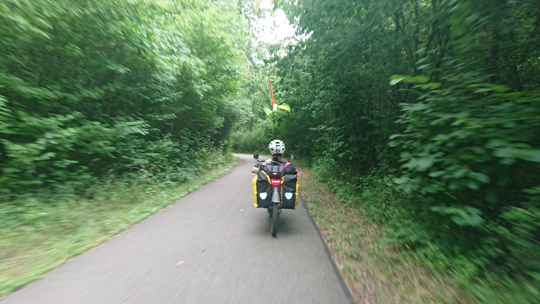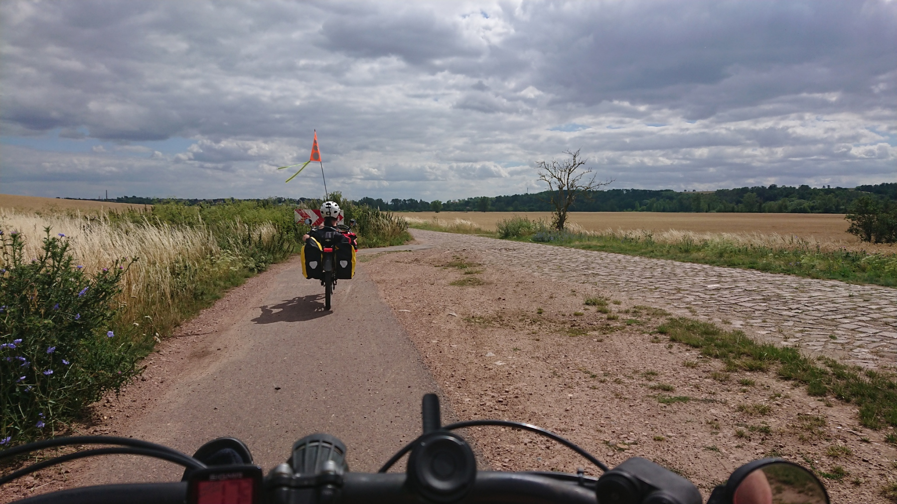 Wieder wechseln wir sie Saaleseite. Und dann werden wir umgeleitet. Der Saaleradweg ist gesperrt und wir folgen der Umleitung. Die ist zwar gut beschildert, aber der Weg führt durch Parks und die Wege sind in einem schlechten Zustand, dass auch hier wieder meist nur zwischen 10 und 15 km/h gefahren werden kann. Hinzu kommen noch etliche Querstraßen, die wir kreuzen müssen. Insgesamt brauchen wir für die Umleitung von etwas mehr als 2km rund 10 Minuten – gefühlt aber deutlich länger.