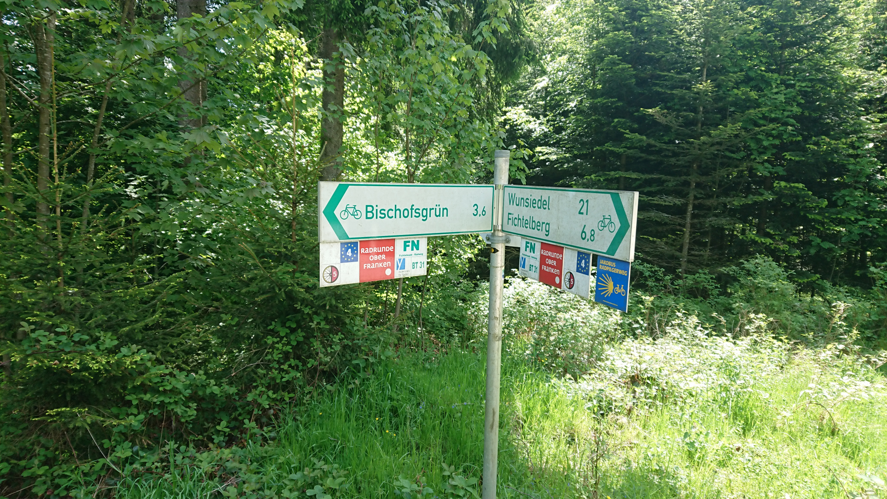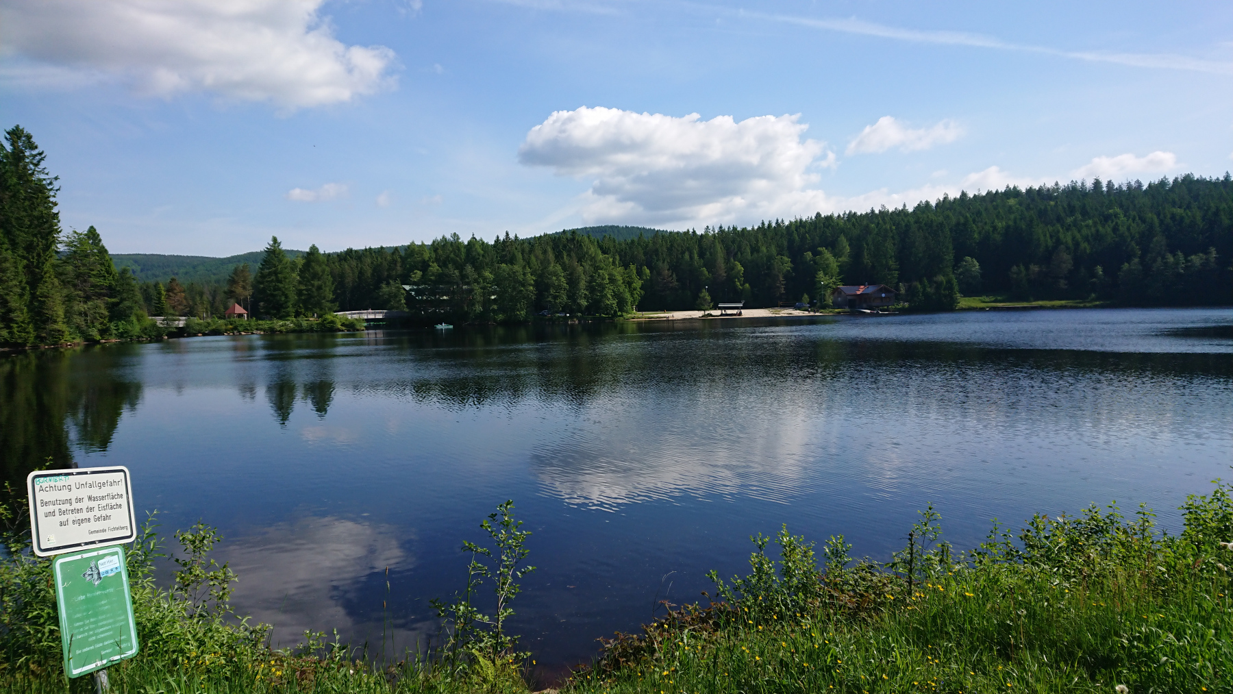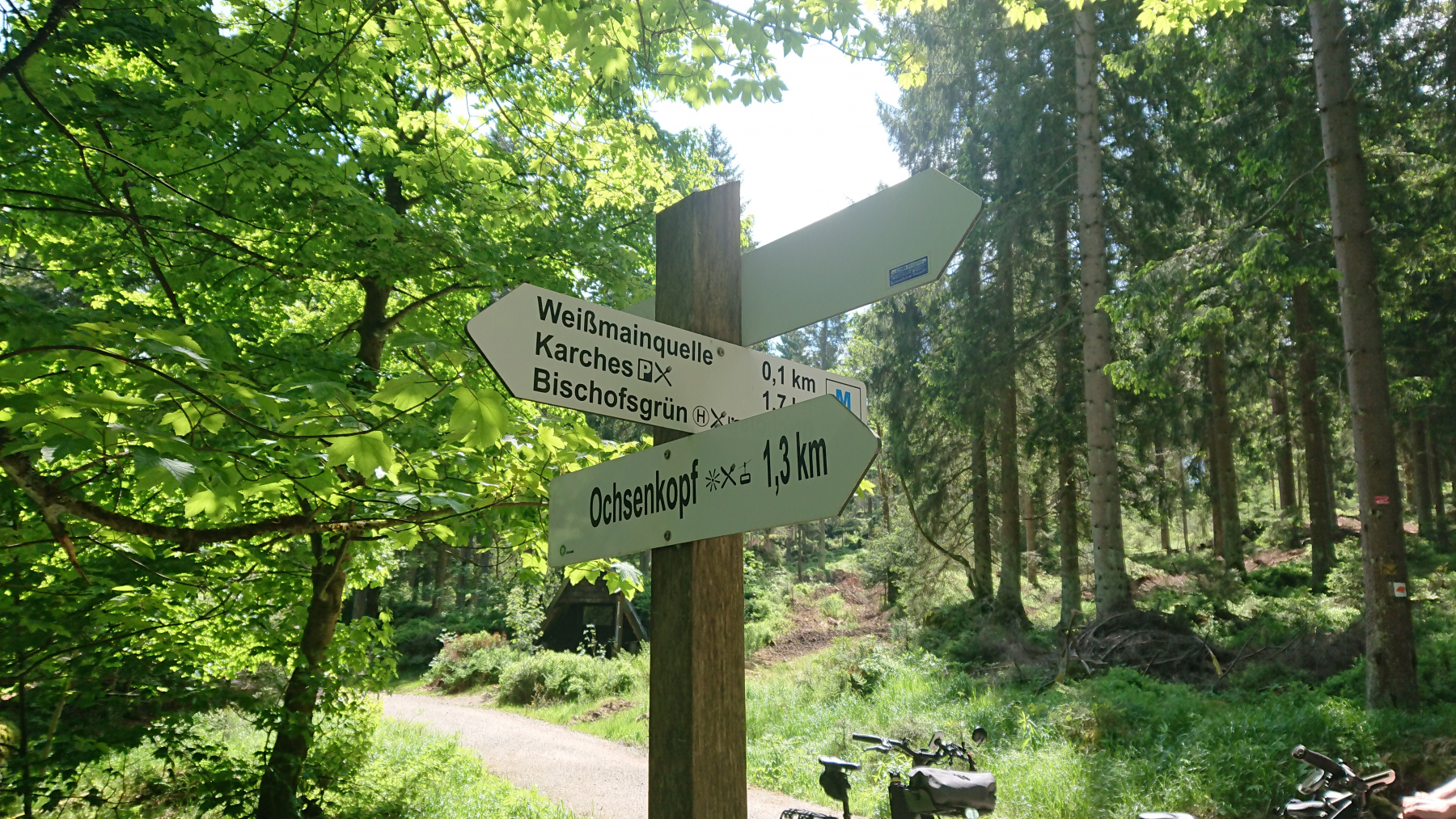 Heute ist für uns Pausetag. Den südlichsten Punkt und damit den entferntesten Punkt haben wir erreicht und wir haben die kleine Wohnung für zwei Nächte gebucht. so können wir heute mit einer kleinen 30km-Tour die Umgebung erkunden und uns dabei und danach gut ausruhen und das schöne Wetter genießen. Ziele heute : Fichtelsee, Ochsenkopf, Mainquelle und Bischofsgrün.