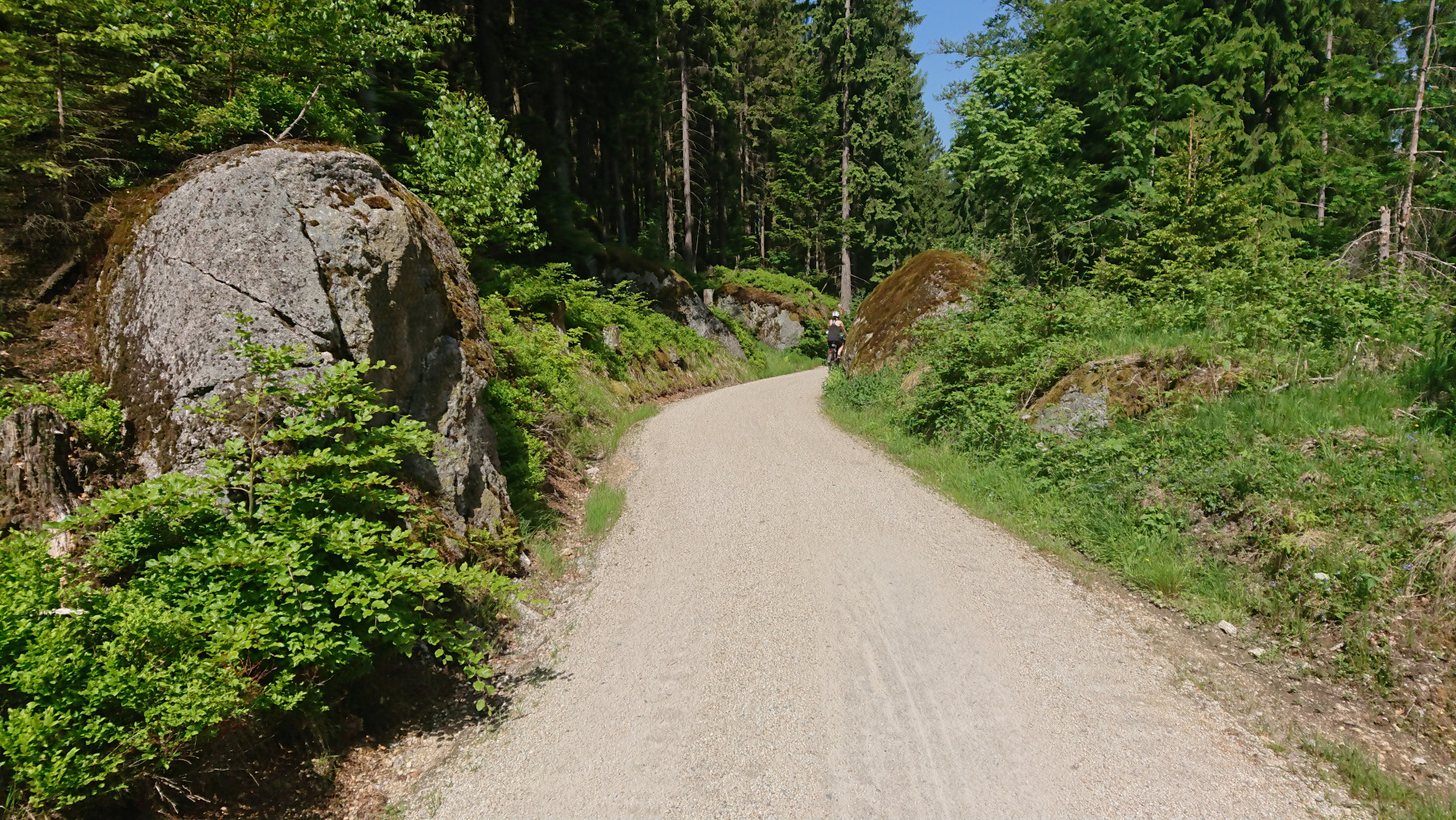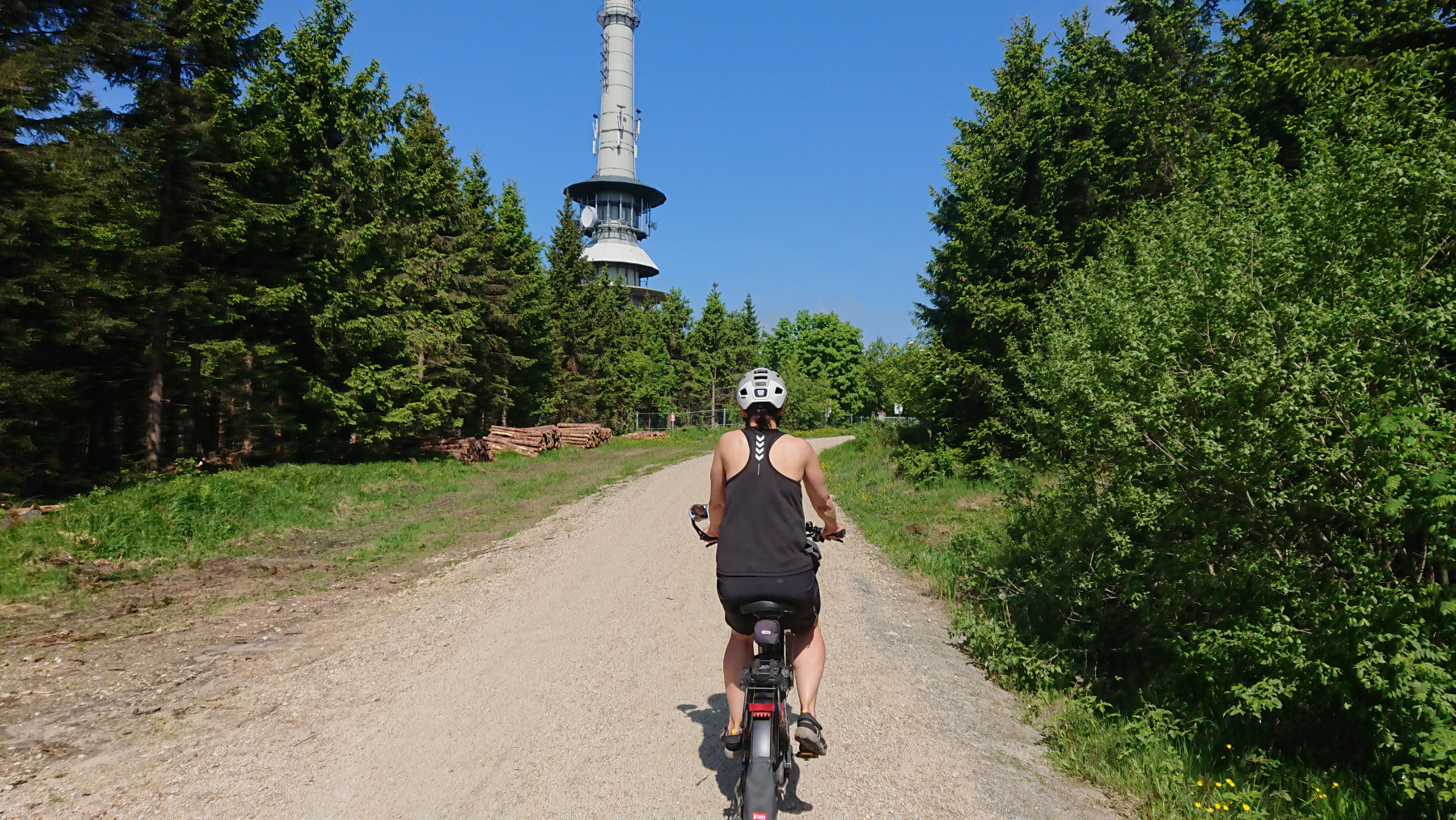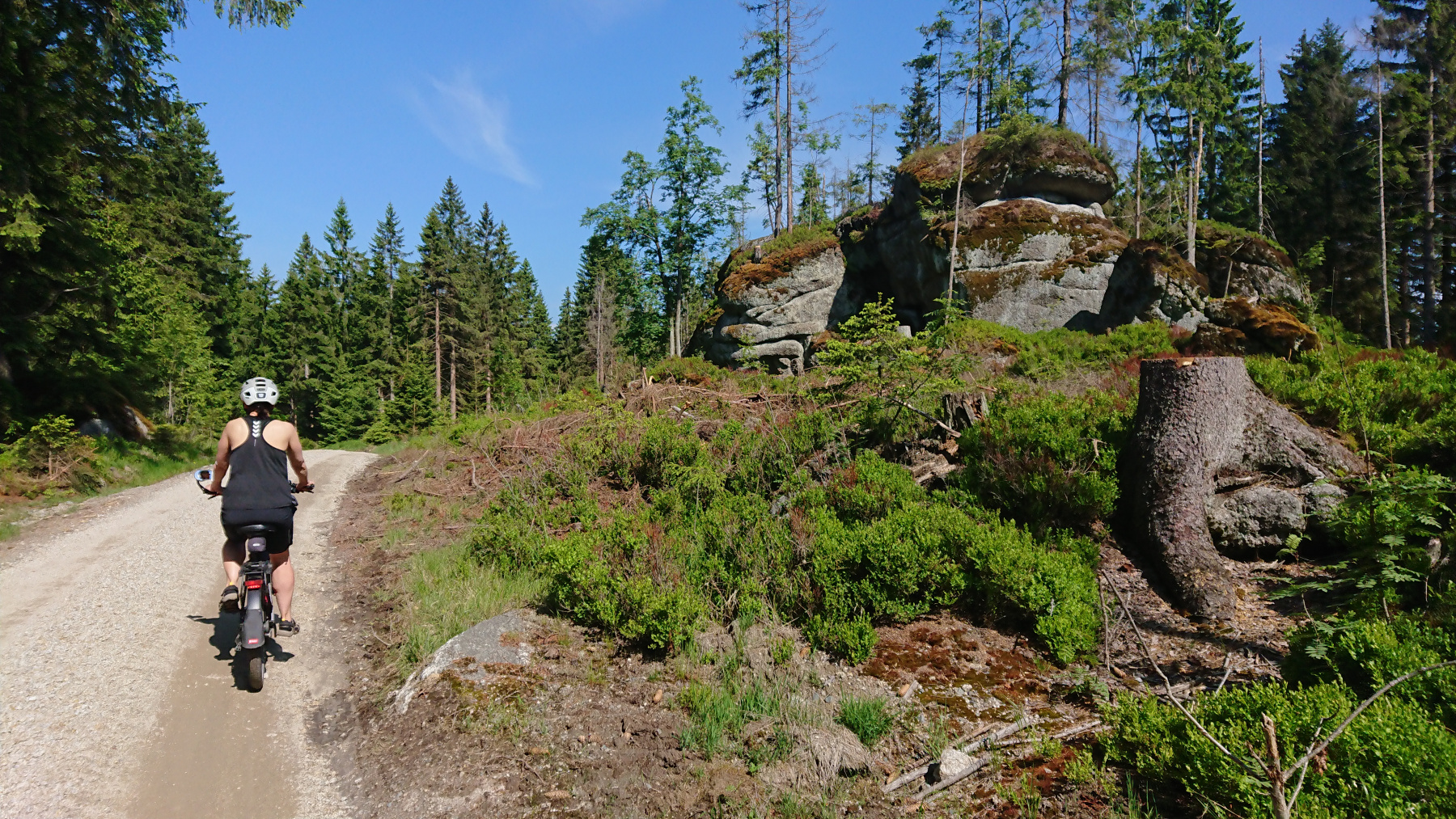 Wür uns geht es nun auf geschotterten aber gut fahrbaren Wegen hinauf auf den Ochsenkopf, der mit 1024m NN. der zweithöchste Gipfel des Filchtelgebirges bildet. Ingesamt gilt es rund 250 Höhenmeter auf gut 4km zu überwinden. Stellenweise sind das dann auch schon mal 15% Steigung.