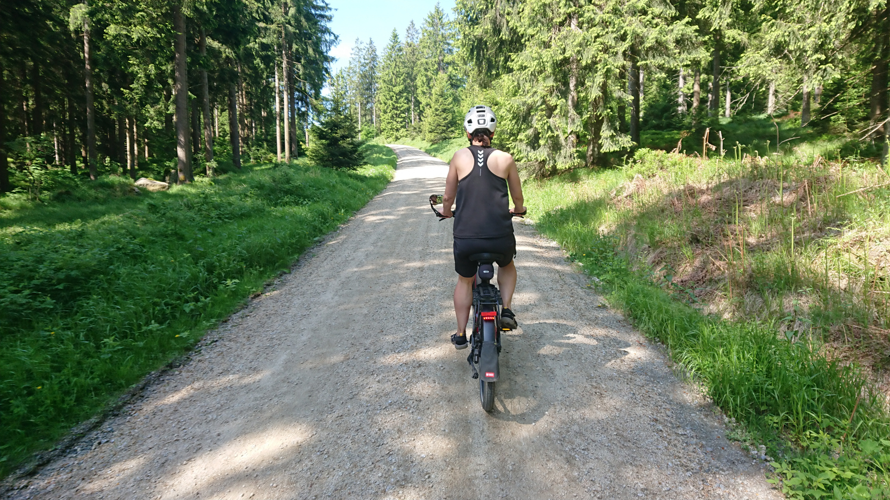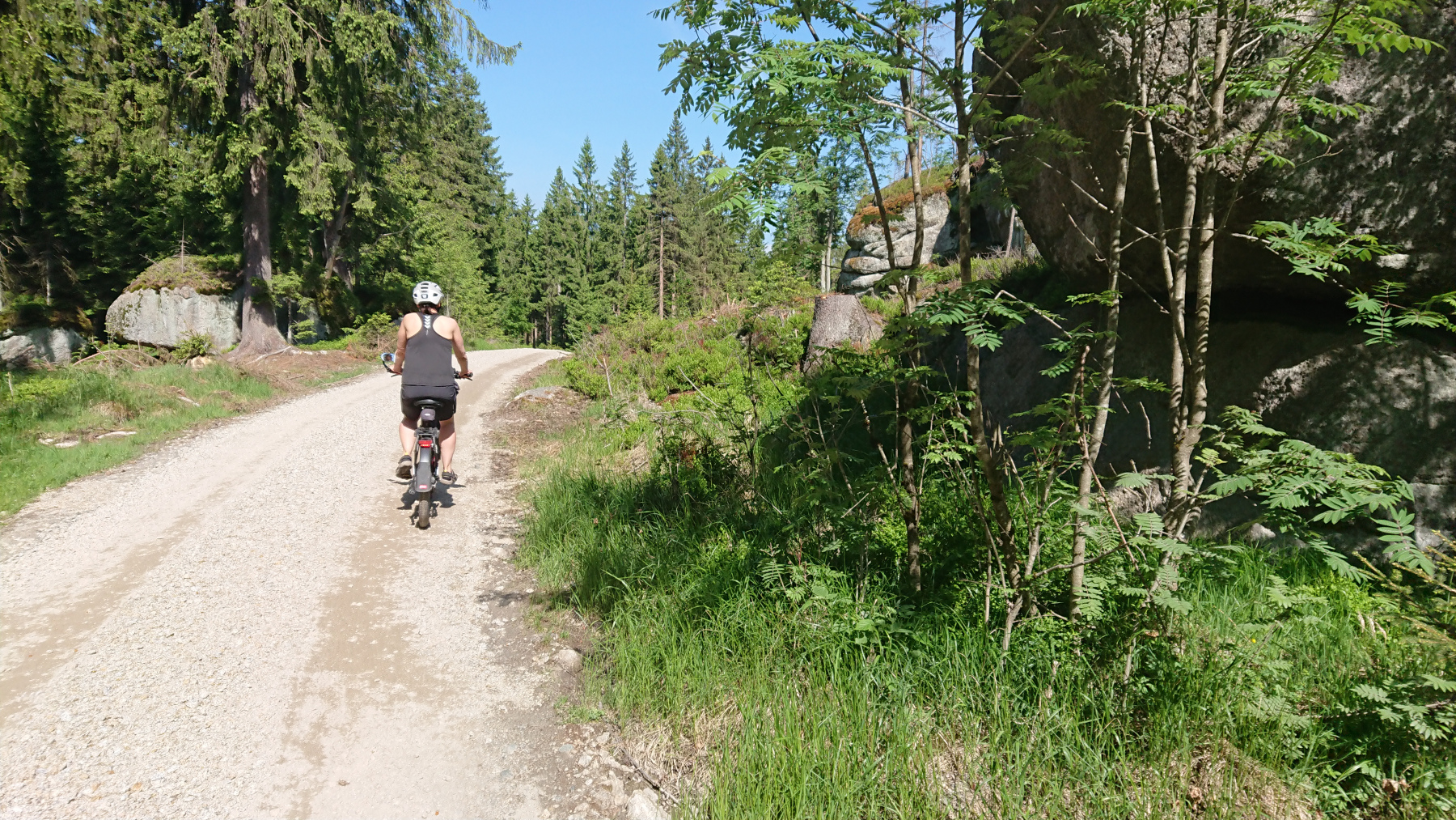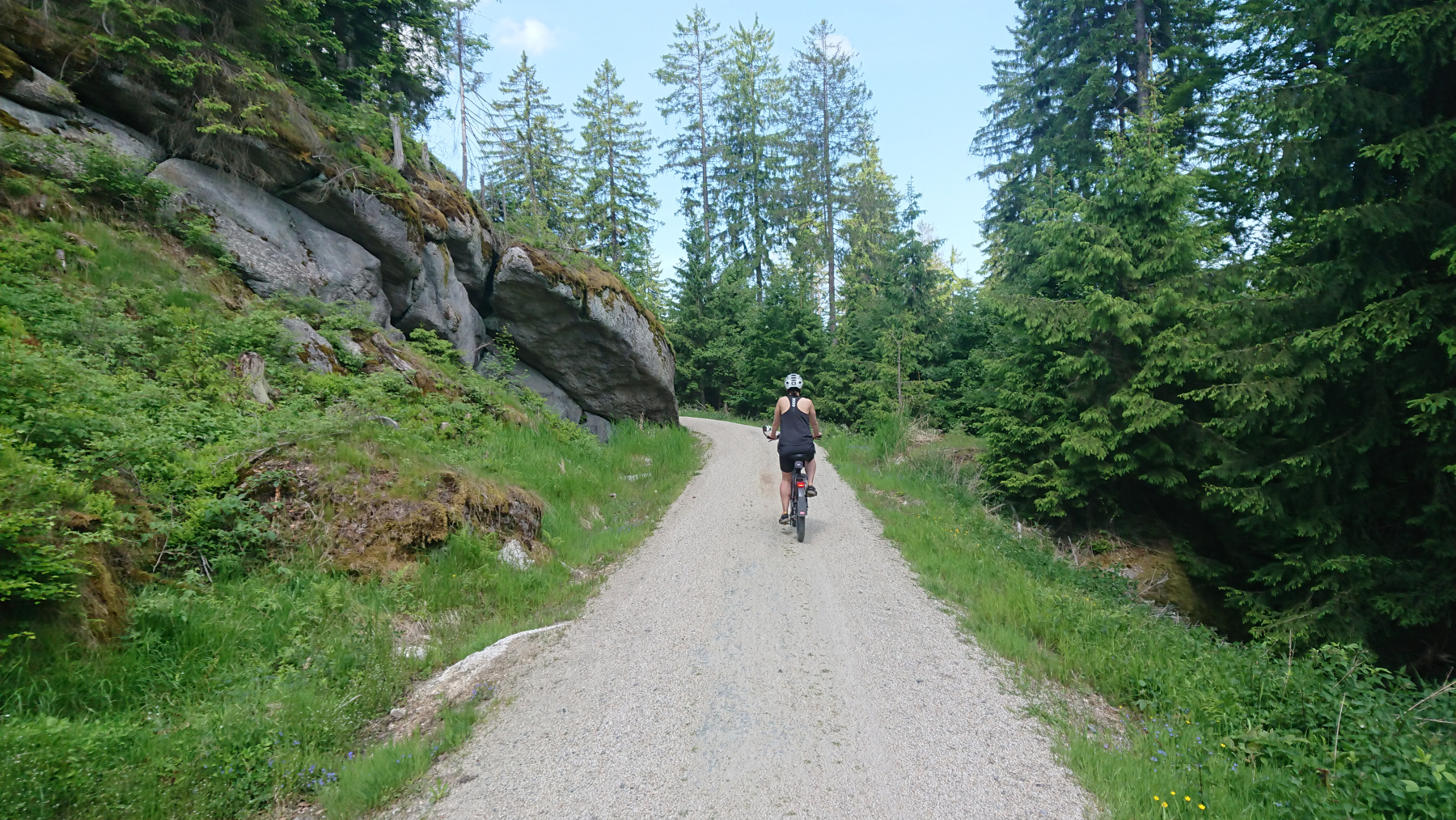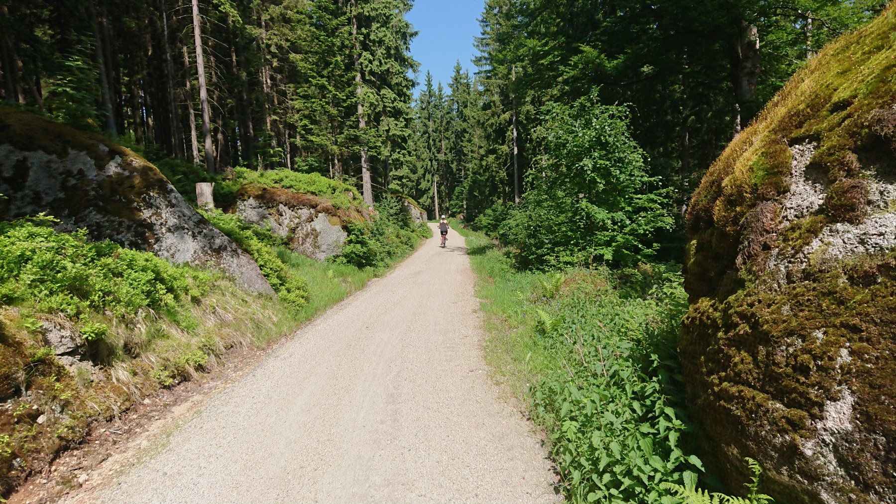 Wür uns geht es nun auf geschotterten aber gut fahrbaren Wegen hinauf auf den Ochsenkopf, der mit 1024m NN. der zweithöchste Gipfel des Filchtelgebirges bildet. Ingesamt gilt es rund 250 Höhenmeter auf gut 4km zu überwinden. Stellenweise sind das dann auch schon mal 15% Steigung.