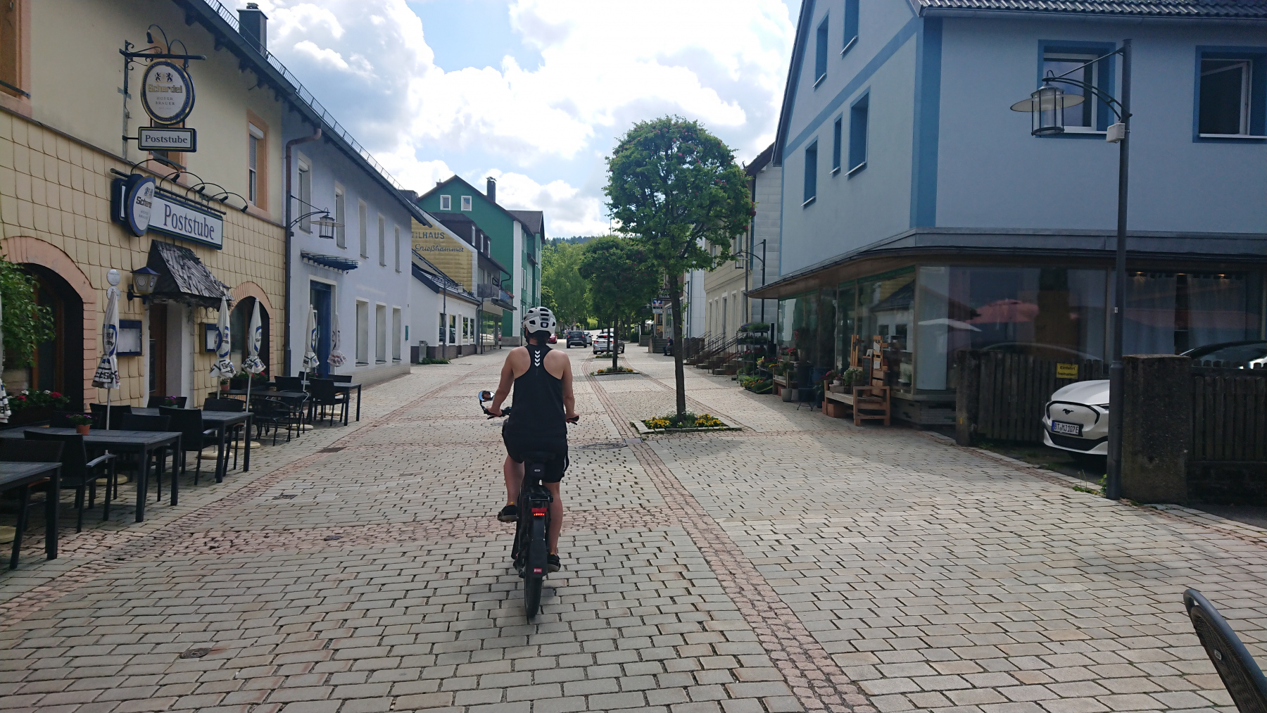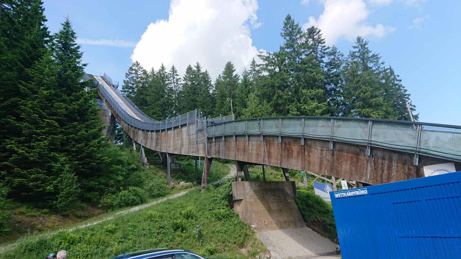 Wir brechen recht früh auf, dann schaffen wir das auf den Ochsenkopf, bevor dort die Massen von Wanderern und Mountainbiker einfallen. Vorher jedoch noch ein kurzer Abstecher zum Bike-Shop. Meine hintere Bremse quietscht und der Techniker hatte sich gestern bereit erklärt, da heute gegen 9:30 Uhr mal draufzuschauen. Und das macht er auch – die Scheibe hat einen ganz leichten Schlag meint er, aber das würde er nun nicht ändern wollen, das würde nur schlimmer werden und das Quietschen müsse man halt aushlaten – wenn möglich. Okay, dann ist es also nichts Ernstes. Mit dem Quietschen kann ich auch Leben.